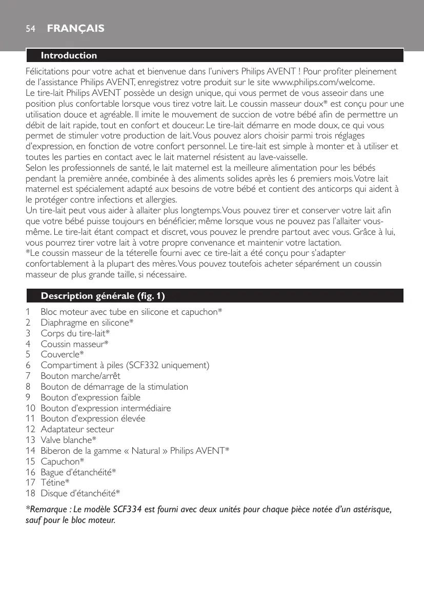 Félicitations pour votre achat et bienvenue dans l’univers Philips AVENT ! Pour profiter pleinement de l’assistance Philips AVENT, enregistrez votre produit sur le site www.philips.com/welcome. Le tire-lait Philips AVENT possède un design unique, qui vous permet de vous asseoir dans une position plus confortable lorsque vous tirez votre lait. Le coussin masseur doux* est conçu pour une utilisation douce et agréable. Il imite le mouvement de succion de votre bébé afin de permettre un débit de lait rapide, tout en confort et douceur. Le tire-lait démarre en mode doux, ce qui vous permet de stimuler votre production de lait. Vous pouvez alors choisir parmi trois réglages d’expression, en fonction de votre confort personnel. Le tire-lait est simple à monter et à utiliser et toutes les parties en contact avec le lait maternel résistent au lave-vaisselle. Selon les professionnels de santé, le lait maternel est la meilleure alimentation pour les bébés pendant la première année, combinée à des aliments solides après les 6 premiers mois. Votre lait maternel est spécialement adapté aux besoins de votre bébé et contient des anticorps qui aident à le protéger contre infections et allergies. Un tire-lait peut vous aider à allaiter plus longtemps. Vous pouvez tirer et conserver votre lait afin que votre bébé puisse toujours en bénéficier, même lorsque vous ne pouvez pas l’allaiter vousmême. Le tire-lait étant compact et discret, vous pouvez le prendre partout avec vous. Grâce à lui, vous pourrez tirer votre lait à votre propre convenance et maintenir votre lactation. *Le coussin masseur de la téterelle fourni avec ce tire-lait a été conçu pour s’adapter confortablement à la plupart des mères. Vous pouvez toutefois acheter séparément un coussin masseur de plus grande taille, si nécessaire. Description générale (fig. 1)