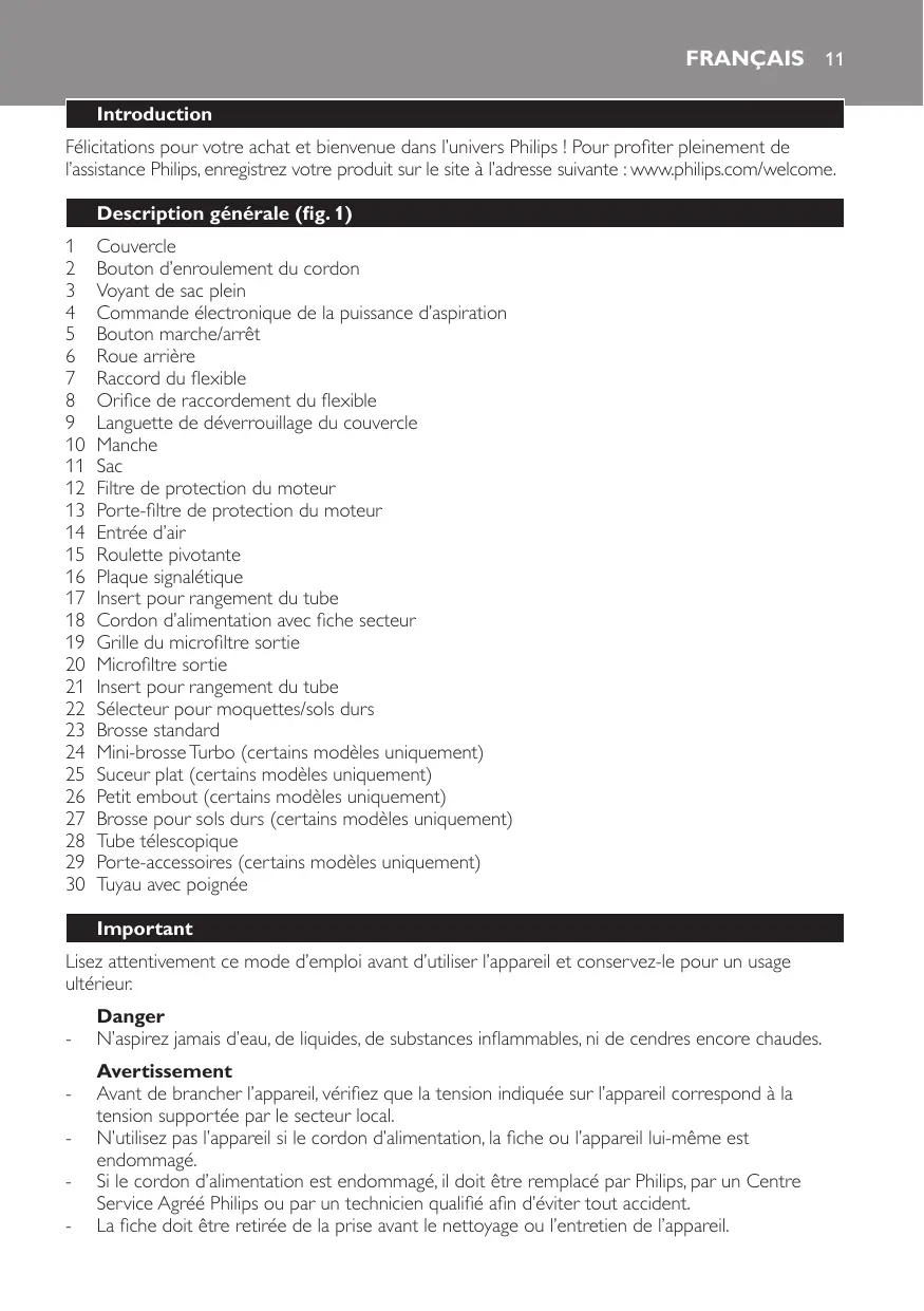 Orifice de raccordement du flexible Languette de déverrouillage du couvercle Manche Sac Filtre de protection du moteur Porte-filtre de protection du moteur Entrée d’air Roulette pivotante Plaque signalétique Insert pour rangement du tube Cordon d’alimentation avec fiche secteur Grille du microfiltre sortie Microfiltre sortie Insert pour rangement du tube Sélecteur pour moquettes/sols durs Brosse standard Mini-brosse Turbo (certains modèles uniquement) Suceur plat (certains modèles uniquement) -- Si le cordon d’alimentation est endommagé, il doit être remplacé par Philips, par un Centre Service Agréé Philips ou par un technicien qualifié afin d’éviter tout accident. -- La fiche doit être retirée de la prise avant le nettoyage ou l’entretien de l’appareil.