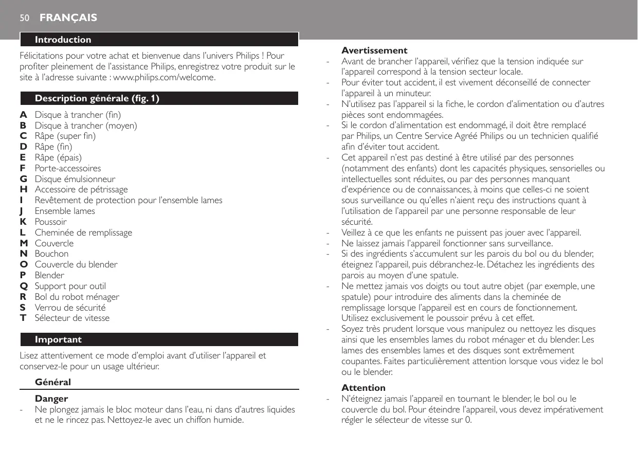 -- Avant de brancher l’appareil, vérifiez que la tension indiquée sur l’appareil correspond à la tension secteur locale. -- Pour éviter tout accident, il est vivement déconseillé de connecter l’appareil à un minuteur. -- N’utilisez pas l’appareil si la fiche, le cordon d’alimentation ou d’autres pièces sont endommagées. -- Si le cordon d’alimentation est endommagé, il doit être remplacé par Philips, un Centre Service Agréé Philips ou un technicien qualifié afin d’éviter tout accident. -- Cet appareil n’est pas destiné à être utilisé par des personnes (notamment des enfants) dont les capacités physiques, sensorielles ou intellectuelles sont réduites, ou par des personnes manquant d’expérience ou de connaissances, à moins que celles-ci ne soient sous surveillance ou qu’elles n’aient reçu des instructions quant à l’utilisation de l’appareil par une personne responsable de leur sécurité. -- Veillez à ce que les enfants ne puissent pas jouer avec l’appareil. -- Ne laissez jamais l’appareil fonctionner sans surveillance. -- Si des ingrédients s’accumulent sur les parois du bol ou du blender, éteignez l’appareil, puis débranchez-le. Détachez les ingrédients des parois au moyen d’une spatule. -- Ne mettez jamais vos doigts ou tout autre objet (par exemple, une spatule) pour introduire des aliments dans la cheminée de remplissage lorsque l’appareil est en cours de fonctionnement. Utilisez exclusivement le poussoir prévu à cet effet. -- Soyez très prudent lorsque vous manipulez ou nettoyez les disques ainsi que les ensembles lames du robot ménager et du blender. Les lames des ensembles lames et des disques sont extrêmement coupantes. Faites particulièrement attention lorsque vous videz le bol ou le blender. Attention -- N’éteignez jamais l’appareil en tournant le blender, le bol ou le couvercle du bol. Pour éteindre l’appareil, vous devez impérativement régler le sélecteur de vitesse sur 0.