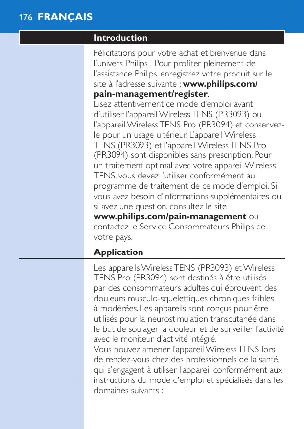 CSA C22.2 No.60601.1 (2008, R:2011), IEC 60601-2-10 (2012), CAN/CSA C22.2 No.606011-11 (2010) Simboli sul sacchetto degli elettrodi -- Questo simbolo indica che il dispositivo non va utilizzato alla guida o quando si utilizzano macchine o quando si svolgono attività che possono mettere in pericolo. 174 Italiano -- Questo simbolo indica che non si devono essere utilizzati elettrodi o danneggiati o usurati che hanno perso il loro potere adesivo. -- Questo simbolo indica che gli elettrodi devono essere usati da una sola persona e non condivisi con altri. -- Questo simbolo indica che gli elettrodi non devono essere posizionati uno sull’altro o così vicini da toccarsi. -- Questo simbolo indica che gli elettrodi non devono essere posizionati sul viso o sul collo. -- Questo simbolo indica che gli elettrodi non devono essere posizionati sul torace. Italiano 175 -- Questo simbolo indica che gli elettrodi non devono essere posizionati ferite aperte, lesioni cancerose, irritazioni o sulla pelle arrossata o infiammata. -- Questo simbolo indica la temperatura massima e minima di stoccaggio per gli elettrodi se riposti per più di un mese. -- Questo è il simbolo della scadenza. Indica la data dopo la quale gli elettrodi non devono essere più usati. Emissioni elettromagnetiche e immunità Electromagnetic Compatibility (EMC) I dispositivi Wireless TENS (PR3093) e Wireless TENS Pro (PR3094) sono approvati in base allo standard di sicurezza EMC EN 60601-1-2. Sono destinati all’uso in ambienti domestici o clinici. Guida al posizionamento degli elettrodi (fig. 101) 176 Français Introduction Félicitations pour votre achat et bienvenue dans l’univers Philips ! Pour profiter pleinement de l’assistance Philips, enregistrez votre produit sur le site à l’adresse suivante : www.philips.com/ pain-management/register. Lisez attentivement ce mode d’emploi avant d’utiliser l’appareil Wireless TENS (PR3093) ou l’appareil Wireless TENS Pro (PR3094) et conservezle pour un usage ultérieur. L’appareil Wireless TENS (PR3093) et l’appareil Wireless TENS Pro (PR3094) sont disponibles sans prescription. Pour un traitement optimal avec votre appareil Wireless TENS, vous devez l’utiliser conformément au programme de traitement de ce mode d’emploi. Si vous avez besoin d’informations supplémentaires ou si avez une question, consultez le site www.philips.com/pain-management ou contactez le Service Consommateurs Philips de votre pays. Application Les appareils Wireless TENS (PR3093) et Wireless TENS Pro (PR3094) sont destinés à être utilisés par des consommateurs adultes qui éprouvent des douleurs musculo-squelettiques chroniques faibles à modérées. Les appareils sont conçus pour être utilisés pour la neurostimulation transcutanée dans le but de soulager la douleur et de surveiller l’activité avec le moniteur d’activité intégré. Vous pouvez amener l’appareil Wireless TENS lors de rendez-vous chez des professionnels de la santé, qui s’engagent à utiliser l’appareil conformément aux instructions du mode d’emploi et spécialisés dans les domaines suivants : Français 177 -- analyse des traitements et des activités du patient -- détermination d’un traitement individuel et adaptation des paramètres de l’appareil grâce à l’application Wireless TENS Pro PC (PR3094 uniquement) L’application PC Wireless TENS Pro ne doit être utilisée que par un professionnel de la santé avec l’appareil Wireless TENS Pro (PR3094). Celle-ci lui permet de proposer des séances de neurostimulation transcutanée plus spécifiques et de suivre et d’analyser les modes d’activité du malade avec l’utilisation de l’appareil. L’appareil est destiné à être utilisé par et sur une personne adulte unique. Il doit toujours être utilisé conformément aux instructions d’utilisation et aux consignes de sécurité incluses dans ce mode d’emploi et aux fins pour lesquelles il a été conçu. Neurostimulation transcutanée et gestion de la douleur La neurostimulation transcutanée est une méthode de soulagement de la douleur non invasive pour laquelle il existe une preuve clinique de diminution de la douleur. L’appareil de neurostimulation transcutanée est utilisé quotidiennement par des kinésithérapeutes et autres professionnels de la santé. Lors du traitement avec cet appareil, des impulsions électriques sont envoyées sur la surface de la peau pour activer les nerfs juste en dessous. Des données cliniques indiquent que cet appareil produit un soulagement de la douleur similaire aux mécanismes de soulagement de la douleur du système nerveux, comme le massage d’une zone douloureuse par exemple. Les impulsions sont générées par des unités de neurostimulation transcutanée alimentées par batterie, qui doivent être connectées aux électrodes à hydrogel auto-adhésives.Vous pouvez choisir parmi un ensemble 178 Français de programmes de neurostimulation transcutanée préréglés avec différents paramètres d’impulsion et vous pouvez régler l’intensité de l’impulsion en fonction de vos préférences. Ce livret contient des informations sur le placement des électrodes et les programmes utilisés pour le traitement. Suivi des activités et gestion de la douleur Nous voulons tous profiter de nos activités quotidiennes. Toutefois, lorsque vous ressentez une douleur, votre réaction instinctive est de l’éviter en réduisant votre niveau d’activité. Par conséquent, vous êtes moins en forme et moins disposé à profiter des choses que vous aimez. Rester actif, sans trop en faire, est important pour éviter d’être pris au piège dans un cycle de douleur persistante. La clé de l’auto-gestion de votre douleur est de la réguler : offrez-vous des périodes d’activité et des périodes de repos au cours de la journée selon ce qui vous convient le mieux. Pour réussir votre stimulation, vous devez répartir vos activités et « faire une p