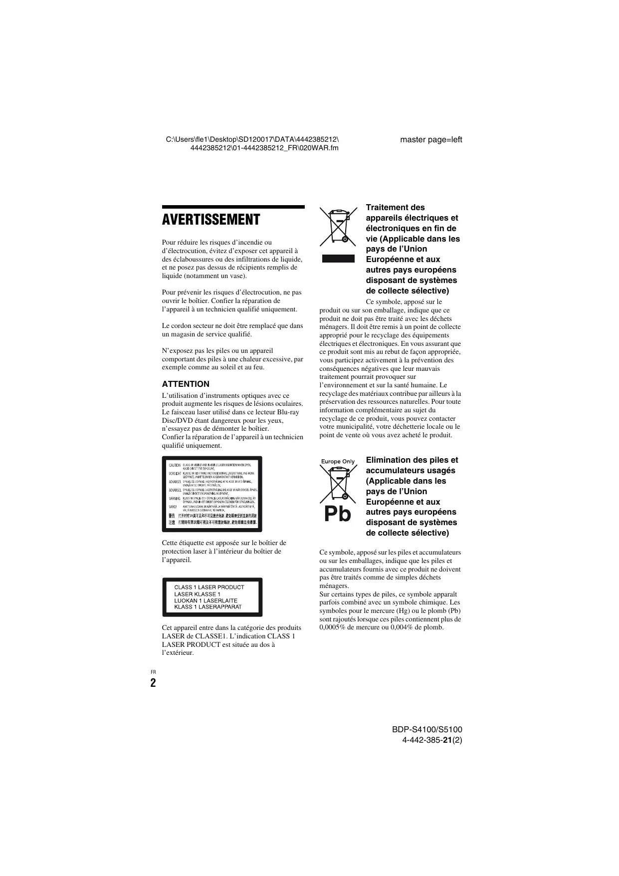 Le faisceau laser utilise dans ce lecteur Blu-rac Disc/DVD étant dangereux pour les yeux, n'essayez pas de démonter le boitier.