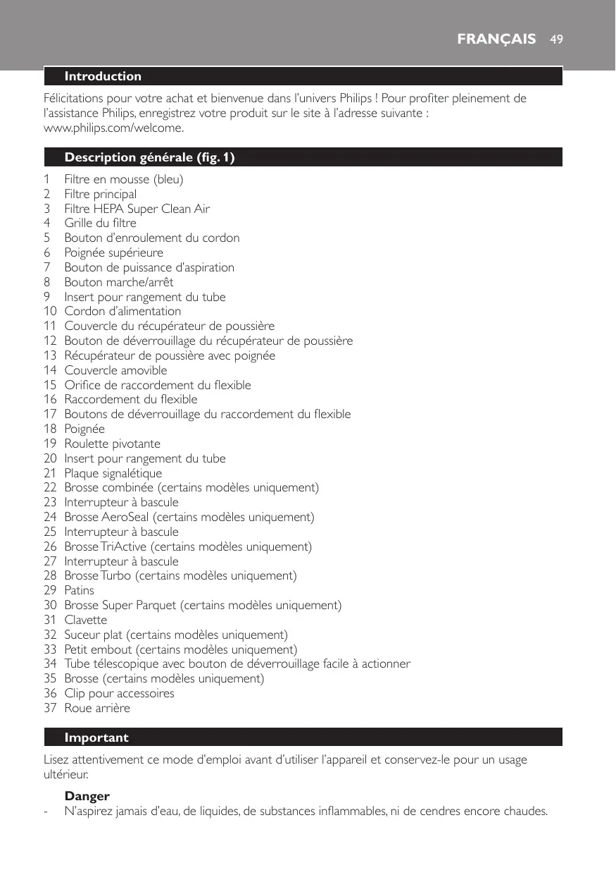 Français 49 Introduction Félicitations pour votre achat et bienvenue dans l’univers Philips ! Pour profiter pleinement de l’assistance Philips, enregistrez votre produit sur le site à l’adresse suivante : www.philips.com/welcome. Description générale (fig. 1) 1 2 3 4 5 6 7 8 9 10 11 12 13 14 15 16 17 18 19 20 21 22 23 24 25 26 27 28 29 30 31 32 33 34 35 36 37