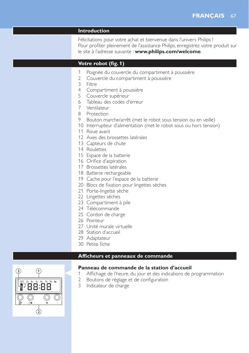 Introduction Félicitations pour votre achat et bienvenue dans l’univers Philips ! Pour profiter pleinement de l’assistance Philips, enregistrez votre produit sur le site à l’adresse suivante : www.philips.com/welcome. Votre robot (fig. 1)