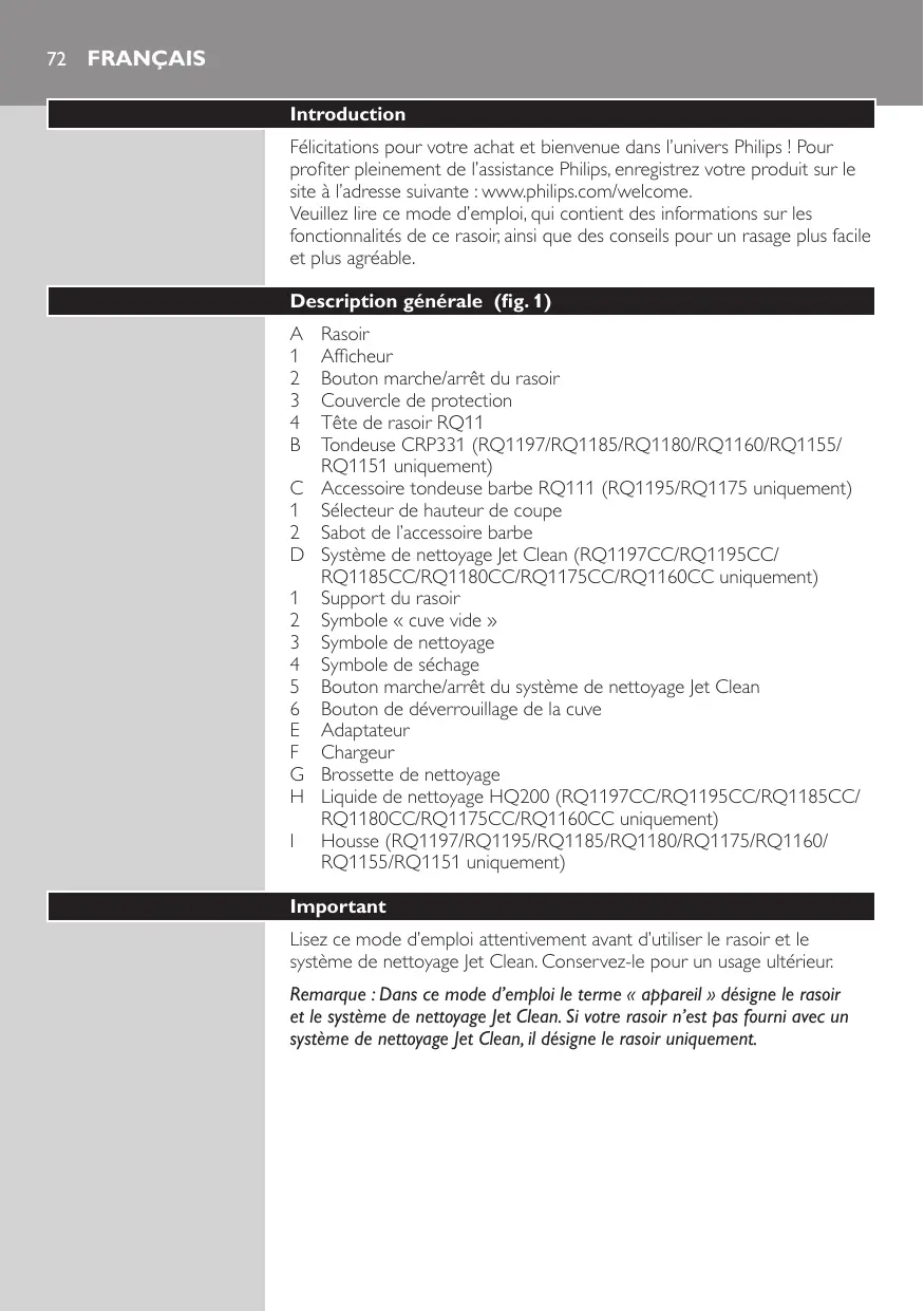 Danger -- Veillez à ce que l’adaptateur ne soit pas en contact avec de l’eau. Avertissement -- L’adaptateur contient un transformateur. N’essayez pas de remplacer la fiche de l’adaptateur pour éviter tout accident. -- Ces appareils ne sont pas destinés à être utilisés par des personnes (notamment des enfants) dont les capacités physiques, sensorielles ou intellectuelles sont réduites, ou par des personnes manquant d’expérience ou de connaissances, à moins qu’elles ne soient sous surveillance ou qu’elles n’aient reçu des instructions quant à l’utilisation des appareils par une personne responsable de leur sécurité. -- Les enfants doivent être surveillés afin de s’assurer qu’ils ne jouent pas avec le rasoir et le système de nettoyage Jet Clean. -- Lorsque vous nettoyez l’appareil, veillez à ce que l’eau ne soit pas trop chaude pour ne pas vous brûler. Attention -- Ne plongez jamais le système de nettoyage Jet Clean ni le chargeur dans l’eau et ne les rincez pas sous le robinet. -- L’appareil et les accessoires ne sont pas conçus pour passer au lave-vaisselle. -- Placez toujours l’appareil sur une surface imperméable. -- Utilisez, rechargez et conservez le rasoir à une température comprise entre 5 °C et 35 °C. -- Utilisez uniquement les accessoires fournis avec ce rasoir ou spécialement conçus pour ce rasoir. -- Si l’adaptateur ou l’un des autres accessoires est endommagé, remplacez-le exclusivement par un adaptateur d’origine afin d’éviter tout accident. -- L’adaptateur transforme la tension de 100-240 V en une tension de sécurité de moins de 24 V. -- N’utilisez jamais l’appareil et les accessoires s’ils sont endommagés. -- Lorsque vous rincez l’appareil, de l’eau peut s’écouler par la prise inférieure. Ce phénomène est normal et ne présente pas de danger car toutes les pièces électroniques à l’intérieur du rasoir sont protégées. Système de nettoyage Jet Clean (RQ1197CC/RQ1195CC/ RQ1185CC/RQ1180CC/RQ1175CC uniquement) Attention -- Utilisez le système de nettoyage Jet Clean uniquement avec le liquide de nettoyage HQ200. -- Placez et utilisez toujours le système de nettoyage Jet Clean sur une surface imperméable stable et horizontale pour éviter toute fuite de liquide. -- Ne plongez jamais le système de nettoyage Jet Clean dans l’eau. -- Videz la cuve et nettoyez-la soigneusement à l’eau chaude tous les 15 jours. -- Le système de nettoyage Jet Clean nettoie le rasoir en profondeur mais ne le désinfecte pas. Il est donc préférable que le rasoir ne soit utilisé que par une seule personne. -- La cuve du système Jet Clean ne peut pas être nettoyée au lave-vaisselle. -- Lorsque le système Jet Clean est prêt à l’emploi, ne le déplacez pas pour éviter toute fuite.