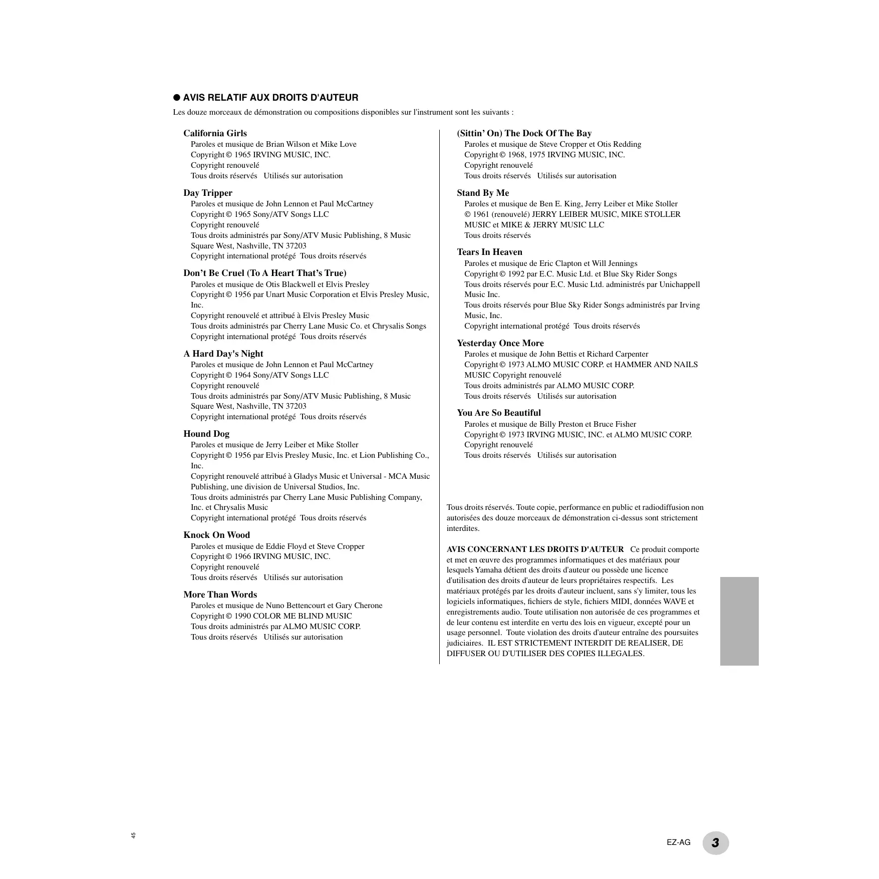 AVIS CONCERNANT LES DROITS D'AUTEUR Ce produit compte et met en œuvre des programmes informatiques et des matérieliaux pour lesquels Yamaha détient des droits d'auteur ou possède une licence