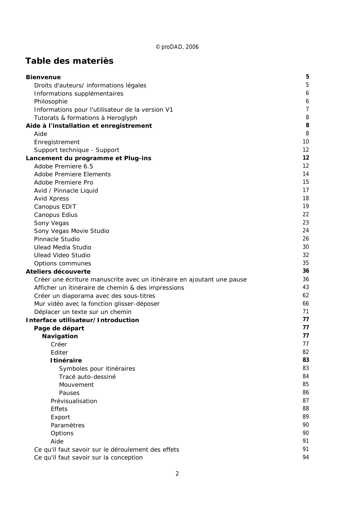 © proDAD, 2006 Table des materiès Bienvenue Droits d'auteurs/ informations légales Informations supplémentaires Philosophie Informations pour l'utilisateur de la version V1 Tutorats & formations à Heroglyph Aide à l'installation et enregistrement Aide Enregistrement Support technique - Support Lancement du programme et Plug-ins Adobe Premiere 6.5 Adobe Premiere Elements Adobe Premiere Pro Avid / Pinnacle Liquid Avid Xpress Canopus EDIT Canopus Edius Sony Vegas Sony Vegas Movie Studio Pinnacle Studio Ulead Media Studio Ulead Video Studio Options communes Ateliers découverte Créer une écriture manuscrite avec un itinéraire en ajoutant une pause Afficher un itinéraire de chemin & des impressions Créer un diaporama avec des sous-titres Mur vidéo avec la fonction glisser-déposer Déplacer un texte sur un chemin Interface utilisateur/Introduction Page de départ Navigation Créer Editer Itinéraire Symboles pour itinéraires Tracé auto-dessiné Mouvement Pauses Prévisualisation Effets Export Paramètres Options Aide Ce qu'il faut savoir sur le déroulement des effets Ce qu'il faut savoir sur la conception