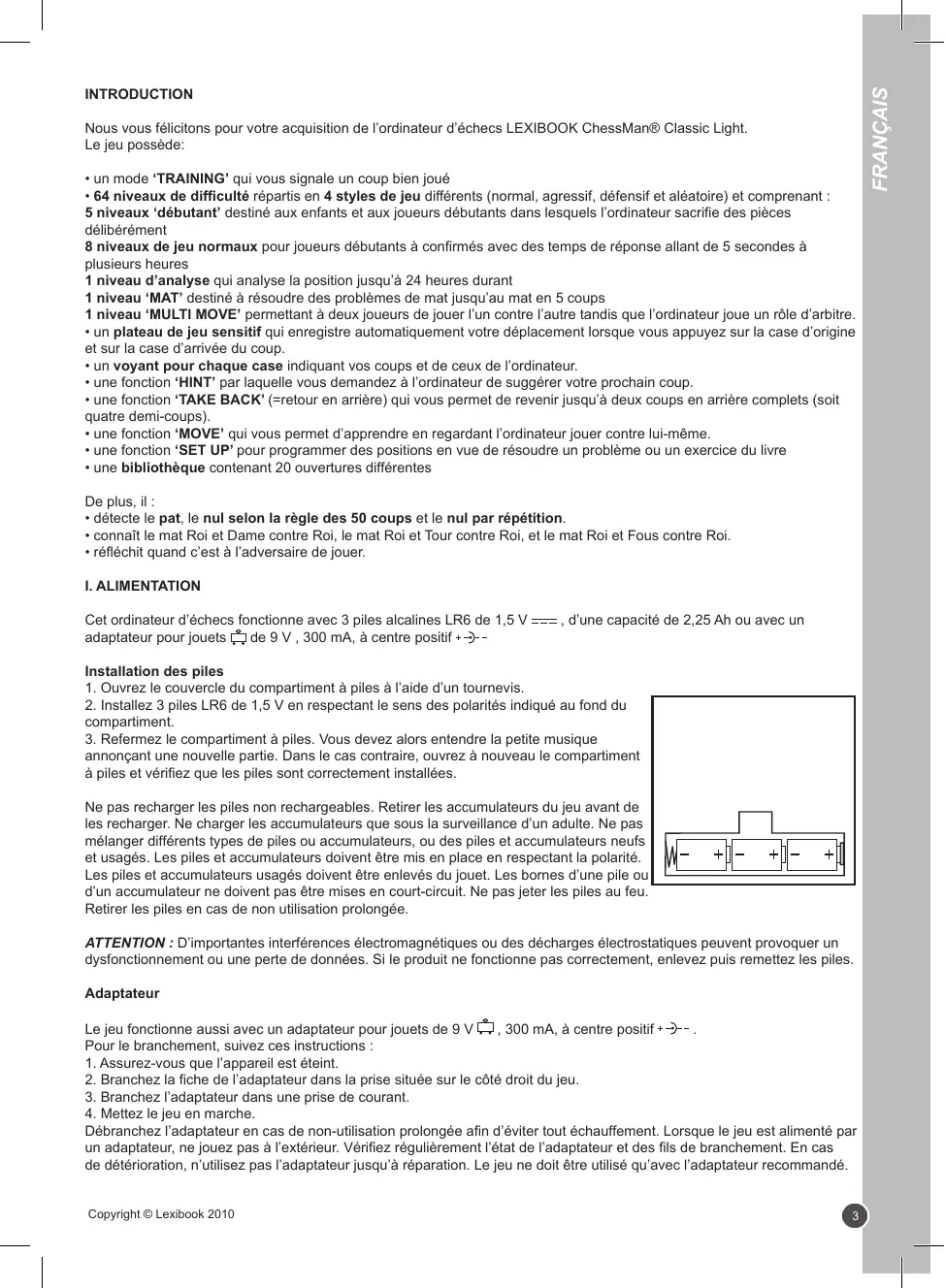 Nous vous félicitons pour votre acquisition de l’ordinateur d’échecs LEXIBOOK ChessMan® Classic Light. Le jeu possède: • un mode ‘TRAINING’ qui vous signale un coup bien joué • 64 niveaux de difficulté répartis en 4 styles de jeu différents (normal, agressif, défensif et aléatoire) et comprenant : 5 niveaux ‘débutant’ destiné aux enfants et aux joueurs débutants dans lesquels l’ordinateur sacrifie des pièces délibérément 8 niveaux de jeu normaux pour joueurs débutants à confirmés avec des temps de réponse allant de 5 secondes à plusieurs heures 1 niveau d’analyse qui analyse la position jusqu’à 24 heures durant 1 niveau ‘MAT’ destiné à résoudre des problèmes de mat jusqu’au mat en 5 coups 1 niveau ‘MULTI MOVE’ permettant à deux joueurs de jouer l’un contre l’autre tandis que l’ordinateur joue un rôle d’arbitre. • un plateau de jeu sensitif qui enregistre automatiquement votre déplacement lorsque vous appuyez sur la case d’origine et sur la case d’arrivée du coup. • un voyant pour chaque case indiquant vos coups et de ceux de l’ordinateur. • une fonction ‘HINT’ par laquelle vous demandez à l’ordinateur de suggérer votre prochain coup. • une fonction ‘TAKE BACK’ (=retour en arrière) qui vous permet de revenir jusqu’à deux coups en arrière complets (soit quatre demi-coups). • une fonction ‘MOVE’ qui vous permet d’apprendre en regardant l’ordinateur jouer contre lui-même. • une fonction ‘SET UP’ pour programmer des positions en vue de résoudre un problème ou un exercice du livre • une bibliothèque contenant 20 ouvertures différentes De plus, il : • détecte le pat, le nul selon la règle des 50 coups et le nul par répétition. • connaît le mat Roi et Dame contre Roi, le mat Roi et Tour contre Roi, et le mat Roi et Fous contre Roi. • réfléchit quand c’est à l’adversaire de jouer. I. ALIMENTATION Cet ordinateur d’échecs fonctionne avec 3 piles alcalines LR6 de 1,5 V adaptateur pour jouets de 9 V , 300 mA, à centre positif