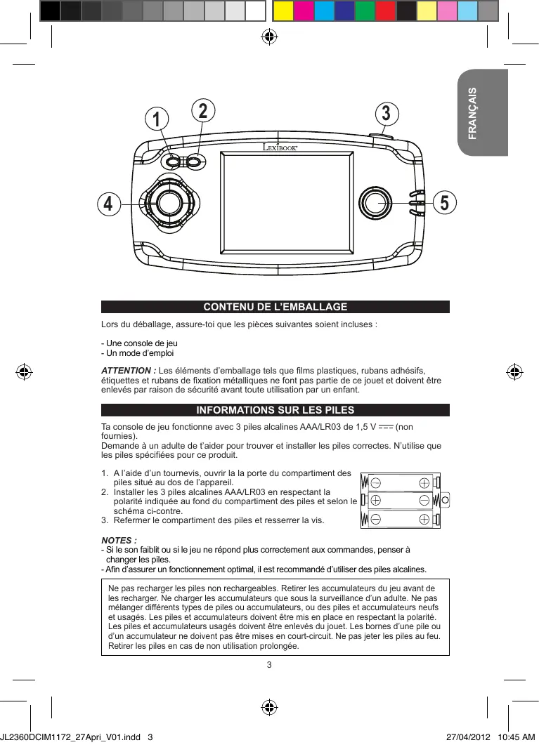 NOTES : - Si le son faiblit ou si le jeu ne répond plus correctement aux commandes, penser à changer les piles. - Afin d’assurer un fonctionnement optimal, il est recommandé d’utiliser des piles alcalines. Ne pas recharger les piles non rechargeables. Retirer les accumulateurs du jeu avant de les recharger. Ne charger les accumulateurs que sous la surveillance d’un adulte. Ne pas mélanger différents types de piles ou accumulateurs, ou des piles et accumulateurs neufs et usagés. Les piles et accumulateurs doivent être mis en place en respectant la polarité. Les piles et accumulateurs usagés doivent être enlevés du jouet. Les bornes d’une pile ou d’un accumulateur ne doivent pas être mises en court-circuit. Ne pas jeter les piles au feu. Retirer les piles en cas de non utilisation prolongée. JL2360DCIM1172_27Apri_V01.indd 3