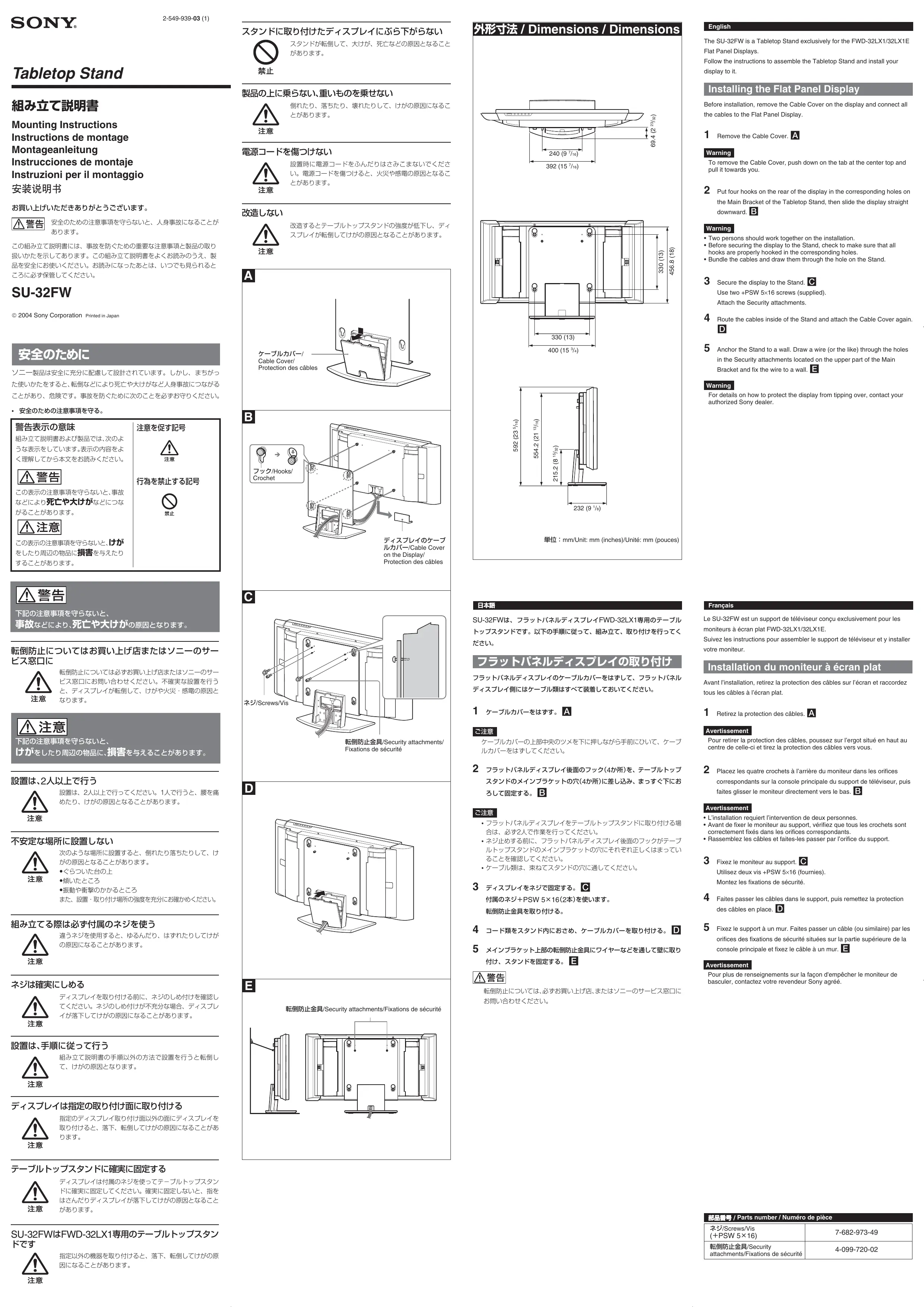 Téléchargez la notice de votre Support d'écran au format PDF gratuitement ! Retrouvez votre notice SU-32FW - SONY et reprennez votre appareil électronique en main. Sur cette page sont publiés tous les documents nécessaires à l'utilisation de votre appareil SU-32FW de la marque SONY.