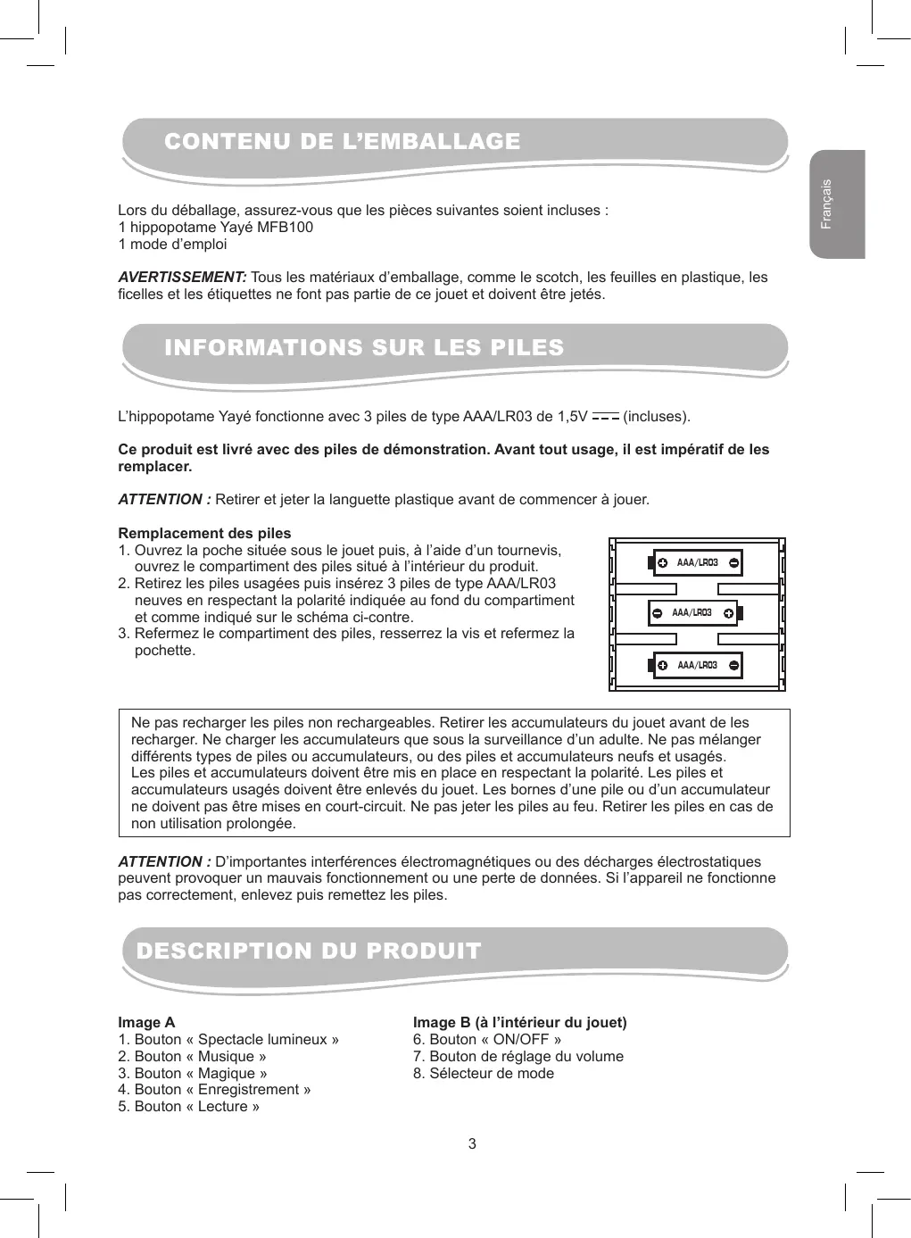 Ne pas recharger les piles non rechargeables. Retirer les accumulateurs du jouet avant de les recharger. Ne charger les accumulateurs que sous la surveillance d'un adulte. Ne pas mélanger différents types de piles ou accumulateurs, ou des piles et accumulateurs neufs et usages. Les piles et accumulateurs doivent être mis en place en respectant la polarité. Les piles et accumulateurs usages doivent être enlevés du jouet. Les bornes d'une pile ou d'un accumulateur ne doivent pas été mises en court-circuit. Ne pas jeter les piles au feu. Retirer les piles en cas de non utilisation prolongée.