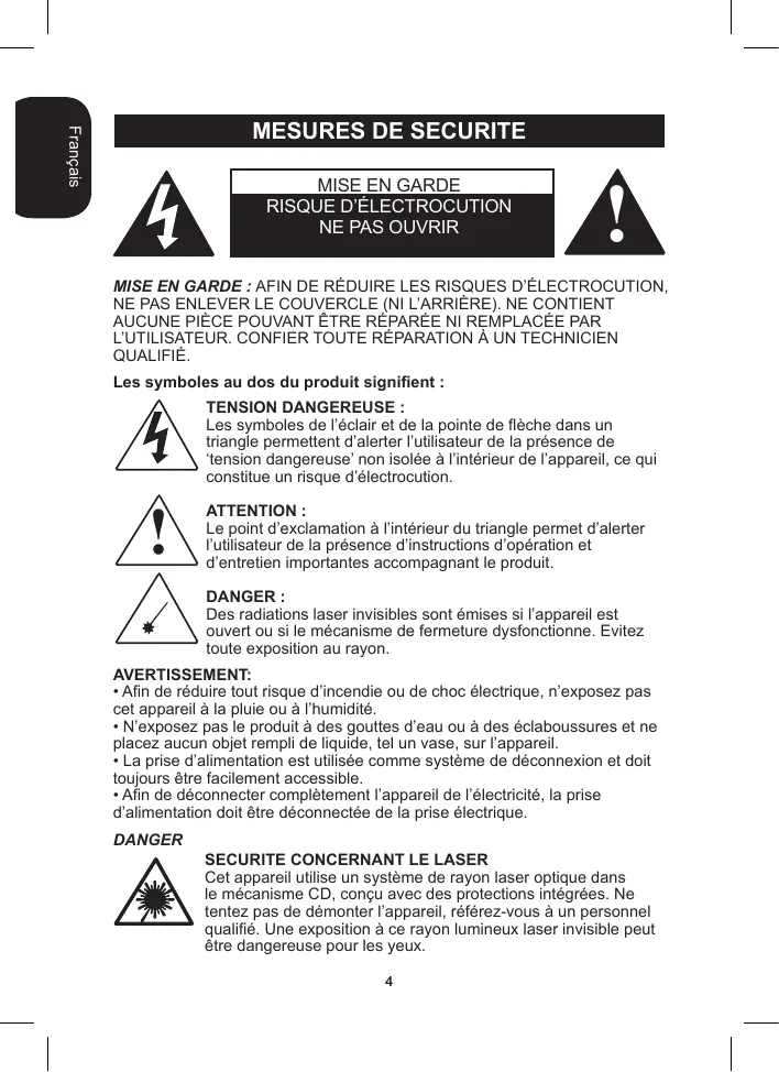 DANGER SECURITE CONCERNANT LE LASER Cet appareil utilise un système de rayon laser optique dans le mécanisme CD, conçu avec des protections intégrées. Ne tentez pas de démonter l’appareil, référez-vous à un personnel qualifié. Une exposition à ce rayon lumineux laser invisible peut