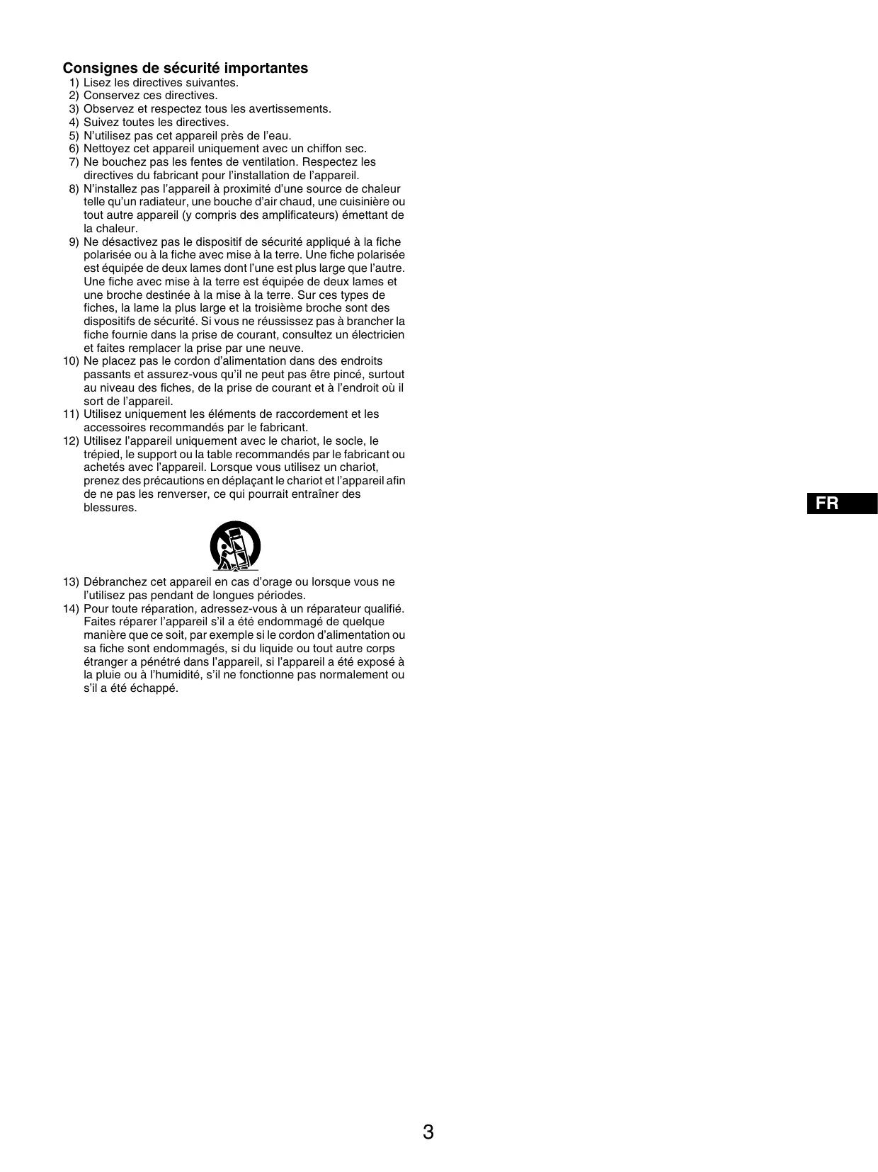 Conservez ces directives. Observez et respectez tous les avertissements. Suivez toutes les directives. N’utilisez pas cet appareil près de l’eau. Nettoyez cet appareil uniquement avec un chiffon sec. Ne bouchez pas les fentes de ventilation. Respectez les directives du fabricant pour l’installation de l’appareil. N’installez pas l’appareil à proximité d’une source de chaleur telle qu’un radiateur, une bouche d’air chaud, une cuisinière ou tout autre appareil (y compris des amplificateurs) émettant de la chaleur. Ne désactivez pas le dispositif de sécurité appliqué à la fiche polarisée ou à la fiche avec mise à la terre. Une fiche polarisée est équipée de deux lames dont l’une est plus large que l’autre. Une fiche avec mise à la terre est équipée de deux lames et une broche destinée à la mise à la terre. Sur ces types de fiches, la lame la plus large et la troisième broche sont des dispositifs de sécurité. Si vous ne réussissez pas à brancher la fiche fournie dans la prise de courant, consultez un électricien et faites remplacer la prise par une neuve. Ne placez pas le cordon d’alimentation dans des endroits passants et assurez-vous qu’il ne peut pas être pincé, surtout au niveau des fiches, de la prise de courant et à l’endroit où il sort de l’appareil. Utilisez uniquement les éléments de raccordement et les accessoires recommandés par le fabricant. Utilisez l’appareil uniquement avec le chariot, le socle, le trépied, le support ou la table recommandés par le fabricant ou achetés avec l’appareil. Lorsque vous utilisez un chariot, prenez des précautions en déplaçant le chariot et l’appareil afin de ne pas les renverser, ce qui pourrait entraîner des blessures.