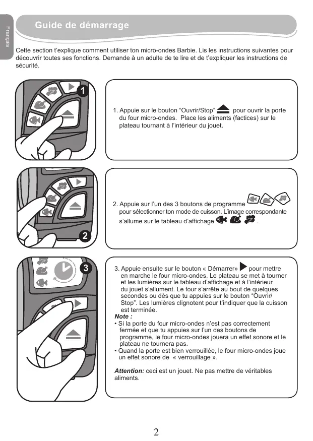 Guide de démarrage Cette section t’explique comment utiliser ton micro-ondes Barbie. Lis les instructions suivantes pour découvrir toutes ses fonctions. Demande à un adulte de te lire et de t’expliquer les instructions de sécurité.