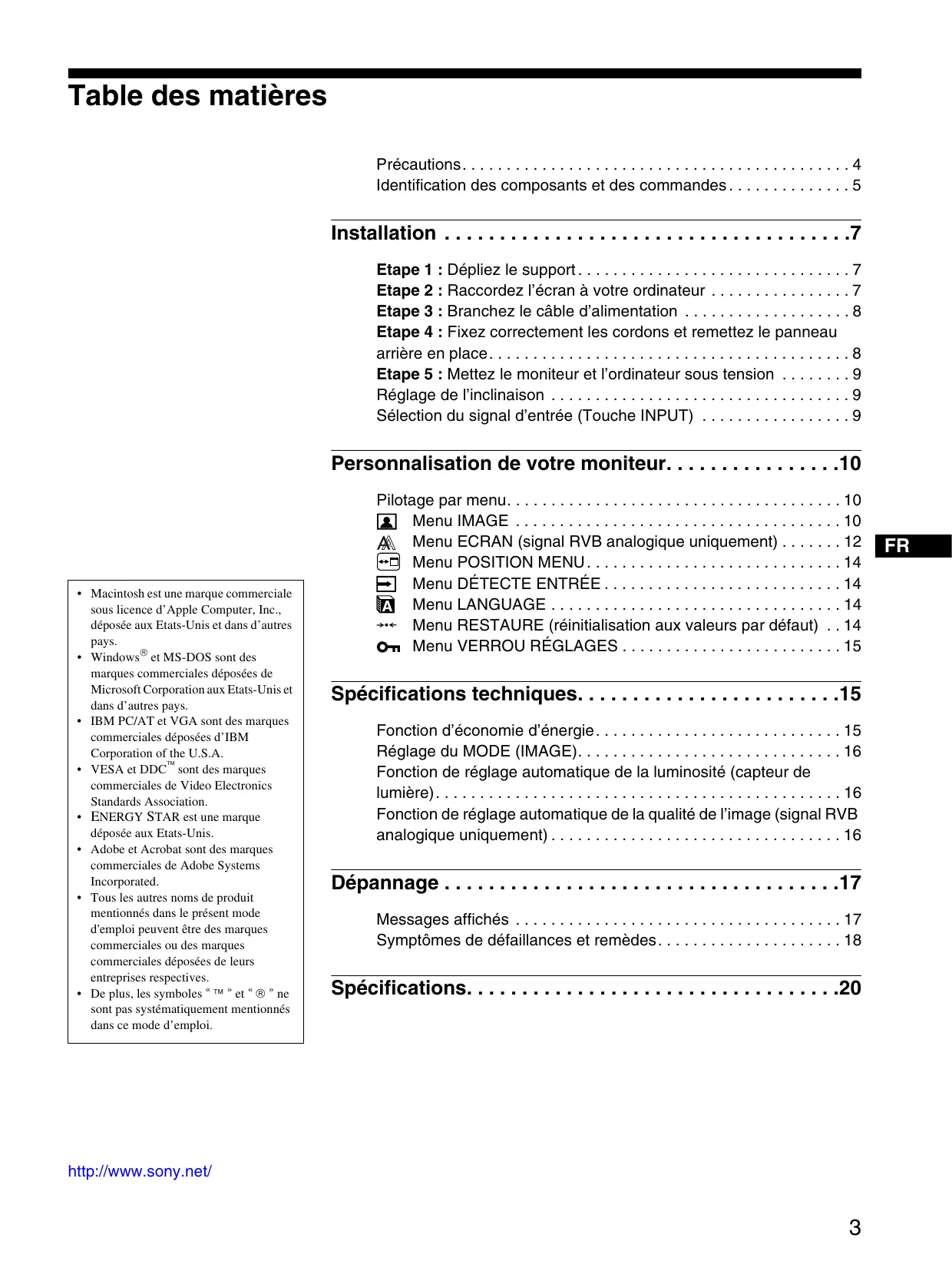 • Windows et MS-DOS sont des marques commerciales déposées de Microsoft Corporation aux Etats-Unis et dans d’autres pays. • IBM PC/AT et VGA sont des marques commerciales déposées d’IBM Corporation of the U.S.A. • VESA et DDC sont des marques commerciales de Video Electronics Standards Association. • ENERGY STAR est une marque déposée aux Etats-Unis. • Adobe et Acrobat sont des marques commerciales de Adobe Systems Incorporated. • Tous les autres noms de produit mentionnés dans le présent mode d'emploi peuvent être des marques commerciales ou des marques commerciales déposées de leurs entreprises respectives. • De plus, les symboles « » et « » ne sont pas systématiquement mentionnés dans ce mode d’emploi.