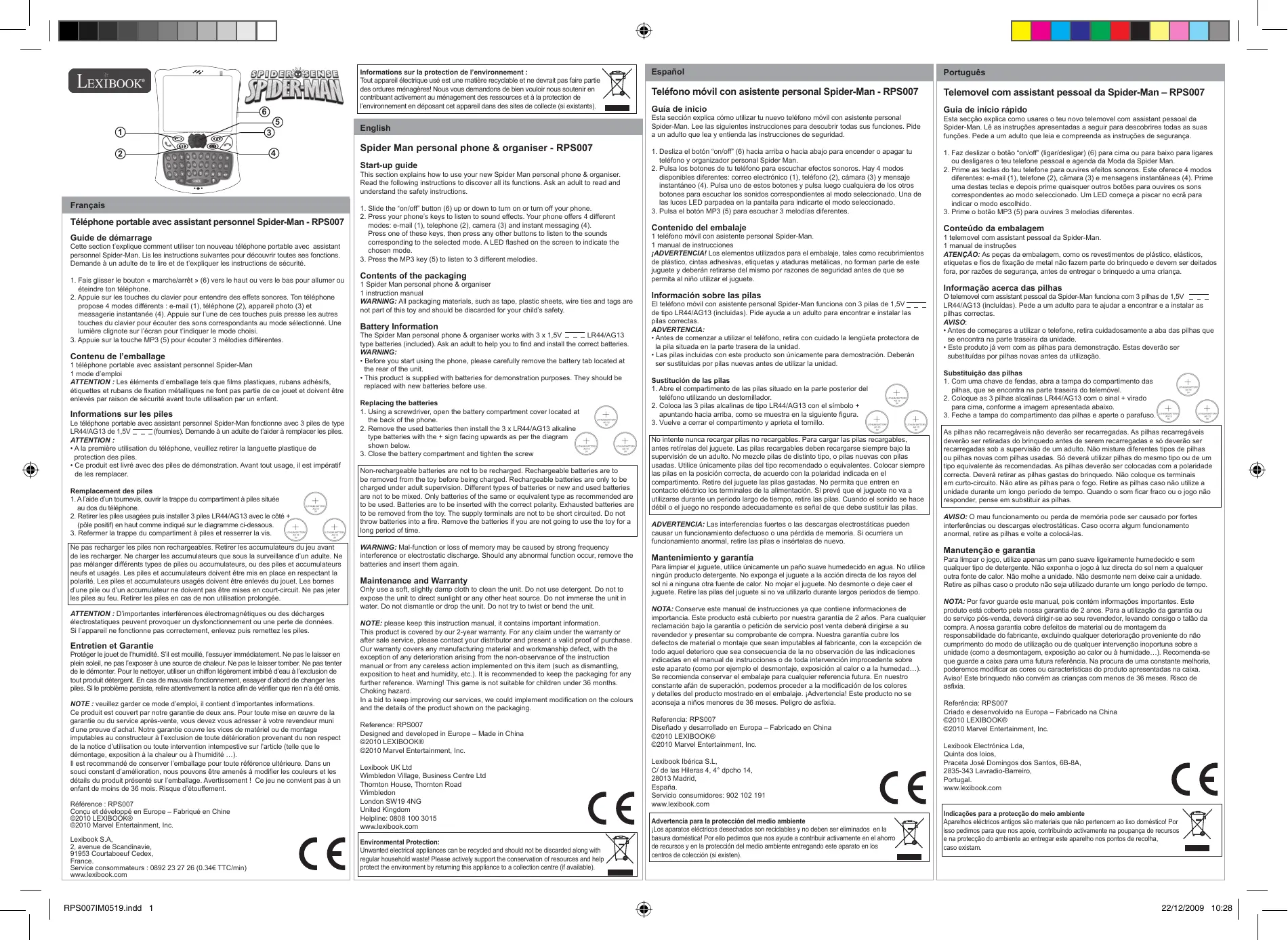 NOTE : veuillez garder ce mode d’emploi, il contient d’importantes informations. Ce produit est couvert par notre garantie de deux ans. Pour toute mise en œuvre de la garantie ou du service après-vente, vous devez vous adresser à votre revendeur muni d’une preuve d’achat. Notre garantie couvre les vices de matériel ou de montage imputables au constructeur à l’exclusion de toute détérioration provenant du non respect de la notice d’utilisation ou toute intervention intempestive sur l’article (telle que le démontage, exposition à la chaleur ou à l’humidité …). Il est recommandé de conserver l’emballage pour toute référence ultérieure. Dans un souci constant d’amélioration, nous pouvons être amenés à modifier les couleurs et les détails du produit présenté sur l’emballage. Avertissement ! Ce jeu ne convient pas à un enfant de moins de 36 mois. Risque d’étouffement. Référence : RPS007 Conçu et développé en Europe – Fabriqué en Chine ©2010 LEXIBOOK® ©2010 Marvel Entertainment, Inc. 2. Coloca las 3 pilas alcalinas de tipo LR44/AG13 con el símbolo + apuntando hacia arriba, como se muestra en la siguiente figura. 3. Vuelve a cerrar el compartimento y aprieta el tornillo. No intente nunca recargar pilas no recargables. Para cargar las pilas recargables, antes retírelas del juguete. Las pilas recargables deben recargarse siempre bajo la supervisión de un adulto. No mezcle pilas de distinto tipo, o pilas nuevas con pilas usadas. Utilice únicamente pilas del tipo recomendado o equivalentes. Colocar siempre las pilas en la posición correcta, de acuerdo con la polaridad indicada en el compartimento. Retire del juguete las pilas gastadas. No permita que entren en contacto eléctrico los terminales de la alimentación. Si prevé que el juguete no va a utilizarse durante un periodo largo de tiempo, retire las pilas. Cuando el sonido se hace débil o el juego no responde adecuadamente es señal de que debe sustituir las pilas. ADVERTENCIA: Las interferencias fuertes o las descargas electrostáticas pueden causar un funcionamiento defectuoso o una pérdida de memoria. Si ocurriera un funcionamiento anormal, retire las pilas e insértelas de nuevo.