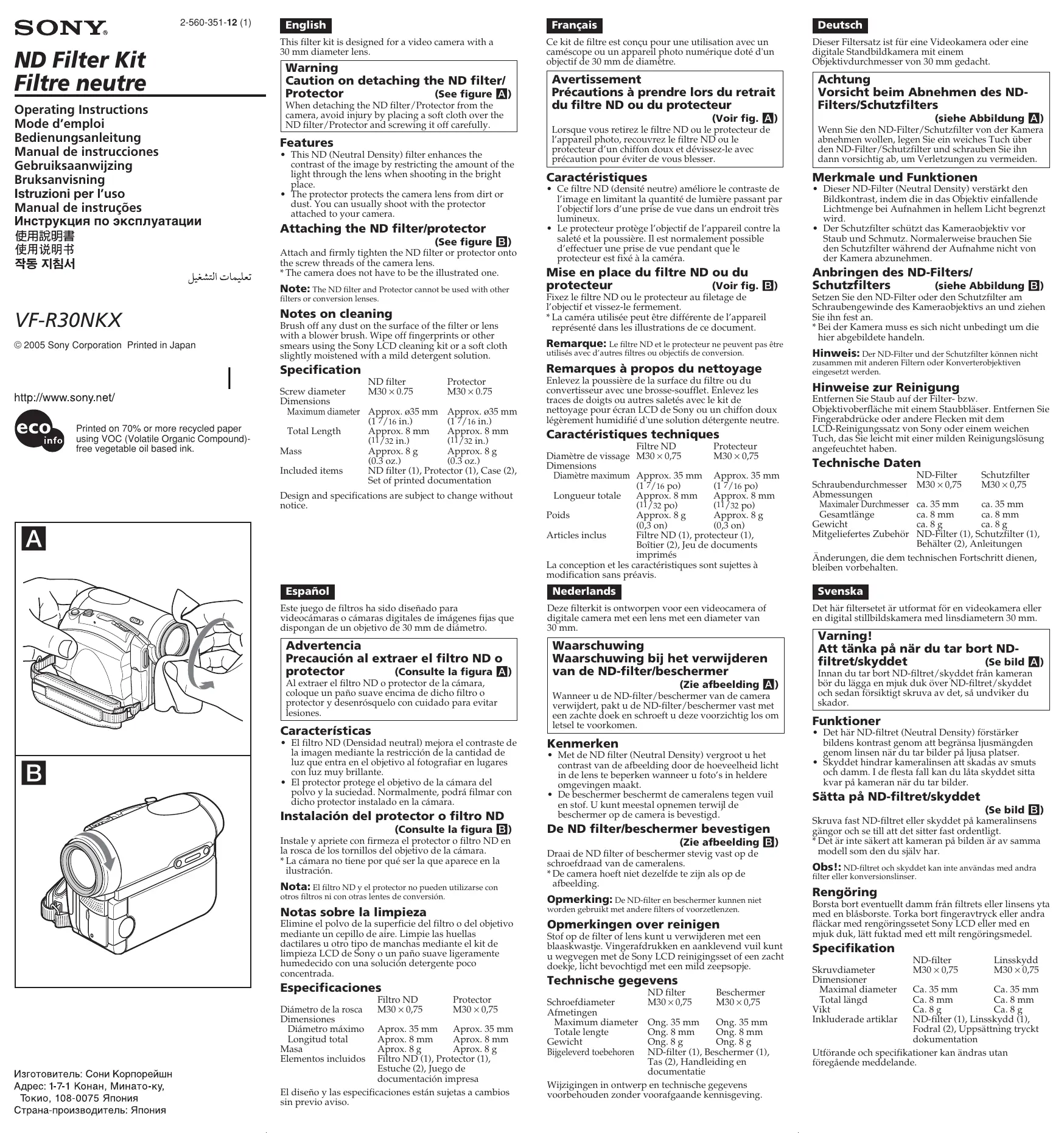 VF-R30NKX - Filtre optique SONY - Notice d'utilisation et mode d'emploi gratuit