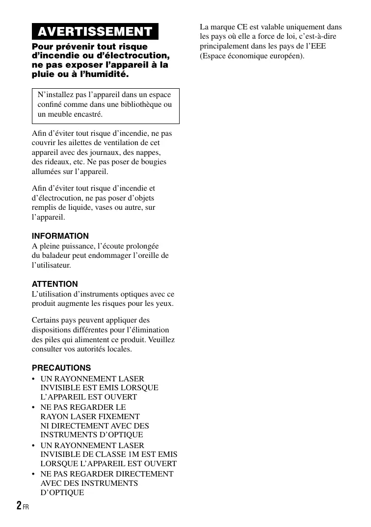 Cette garantie n’est valable qu’au Canada. D-NE319/NE320/NE321 AVERTISSEMENT Pour prévenir tout risque d’incendie ou d’électrocution, ne pas exposer l’appareil à la pluie ou à l’humidité. N’installez pas l’appareil dans un espace confiné comme dans une bibliothèque ou un meuble encastré. Afin d’éviter tout risque d’incendie, ne pas couvrir les ailettes de ventilation de cet appareil avec des journaux, des nappes, des rideaux, etc. Ne pas poser de bougies allumées sur l’appareil. Afin d’éviter tout risque d’incendie et d’électrocution, ne pas poser d’objets remplis de liquide, vases ou autre, sur l’appareil. INFORMATION A pleine puissance, l’écoute prolongée du baladeur peut endommager l’oreille de l’utilisateur. ATTENTION L’utilisation d’instruments optiques avec ce produit augmente les risques pour les yeux. Certains pays peuvent appliquer des dispositions différentes pour l’élimination des piles qui alimentent ce produit. Veuillez consulter vos autorités locales. PRECAUTIONS
