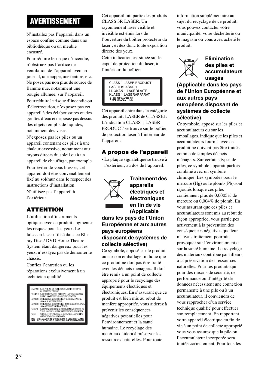 ATTENTION L’utilisation d’instruments optiques avec ce produit augmente les risques pour les yeux. Le faisceau laser utilisé dans ce Bluray Disc / DVD Home Theatre