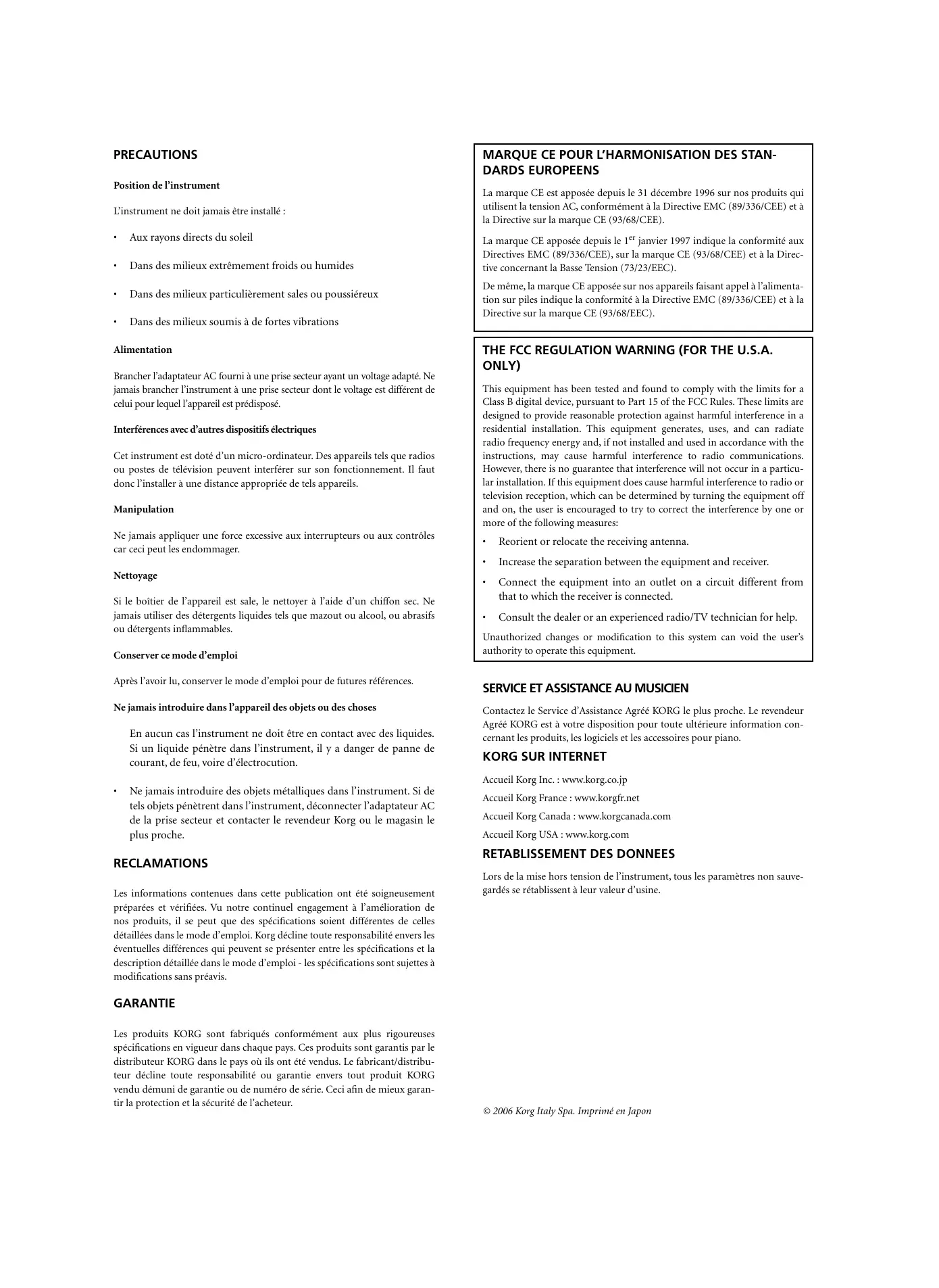 La marque CE apposée depuis le 1er janvier 1997 indique la conformité aux Directives EMC (89/336/CEE), sur la marque CE (93/68/CEE) et à la Directive concernant la Basse Tension (73/23/EEC). De même, la marque CE apposée sur nos appareils faisant appel à l’alimentation sur piles indique la conformité à la Directive EMC (89/336/CEE) et à la Directive sur la marque CE (93/68/EEC).
