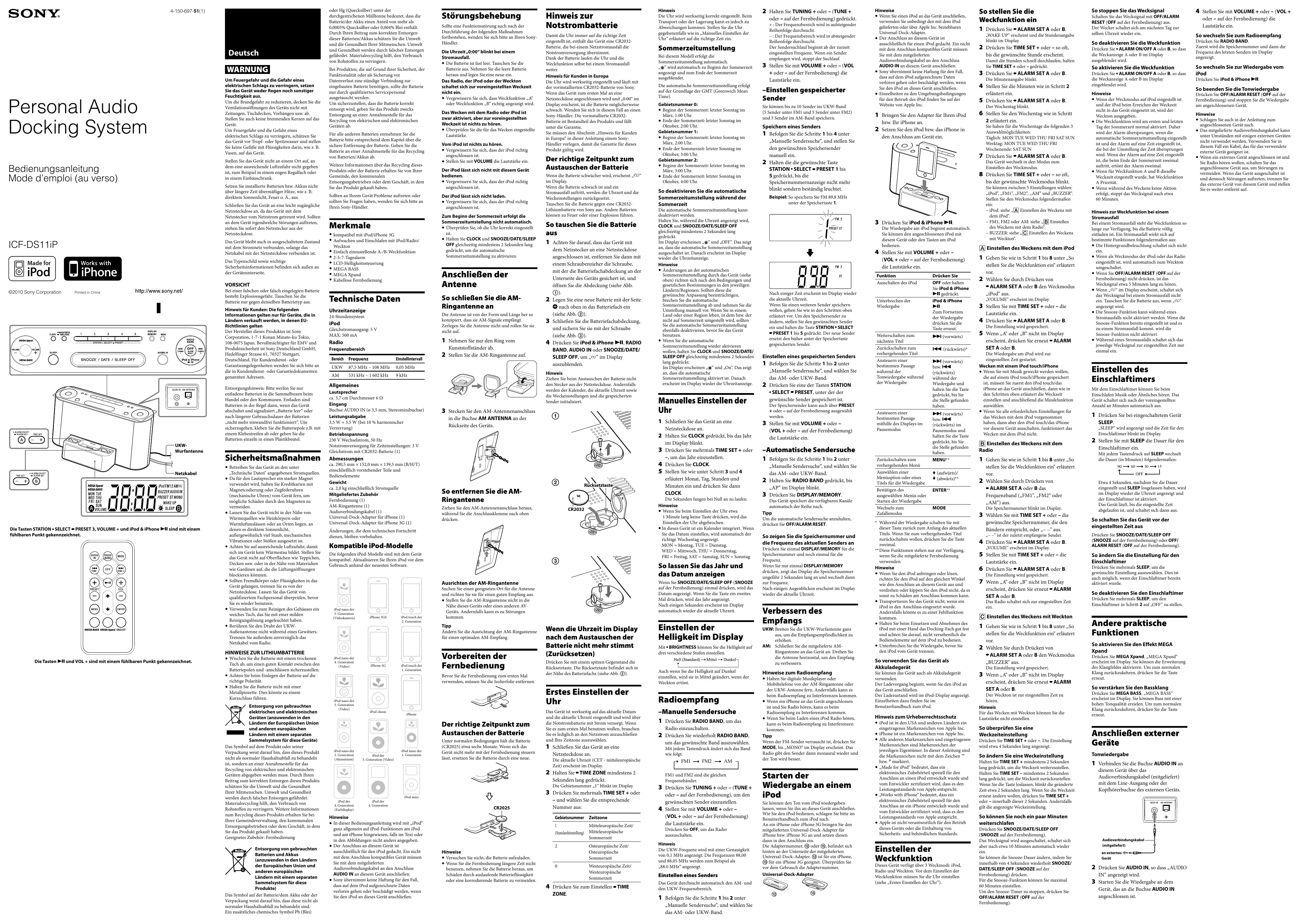Retrouvez gratuitement la notice de l'appareil ICF-DS11IP SONY au format PDF.