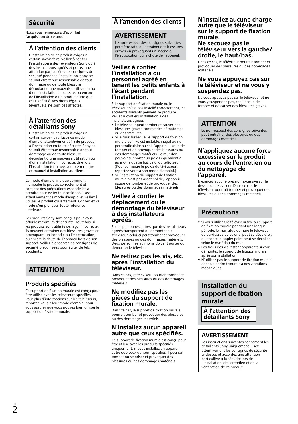 L’installation de ce produit exige un certain savoir-faire. Lisez ce mode d’emploi attentivement afin de procéder à l’installation en toute sécurité. Sony ne saurait être tenue responsable de tout dommage ou de toute blessure découlant d’une mauvaise utilisation ou d’une installation incorrecte. Une fois l’installation terminée, veuillez remettre ce manuel d’installation au client. Ce mode d’emploi indique comment manipuler le produit correctement et contient des précautions essentielles à prendre pour éviter tout accident. Lisez attentivement ce mode d’emploi et veillez à utiliser le produit correctement. Conservez ce mode d’emploi pour toute référence ultérieure. Les produits Sony sont conçus pour vous offrir le maximum de sécurité. Toutefois, si les produits sont utilisés de façon incorrecte, ils peuvent entraîner des blessures graves en provoquant un incendie ou l’électrocution, ou encore la chute de l’appareil hors de son support. Veillez à observer les consignes de sécurité préconisées pour éviter de tels accidents.