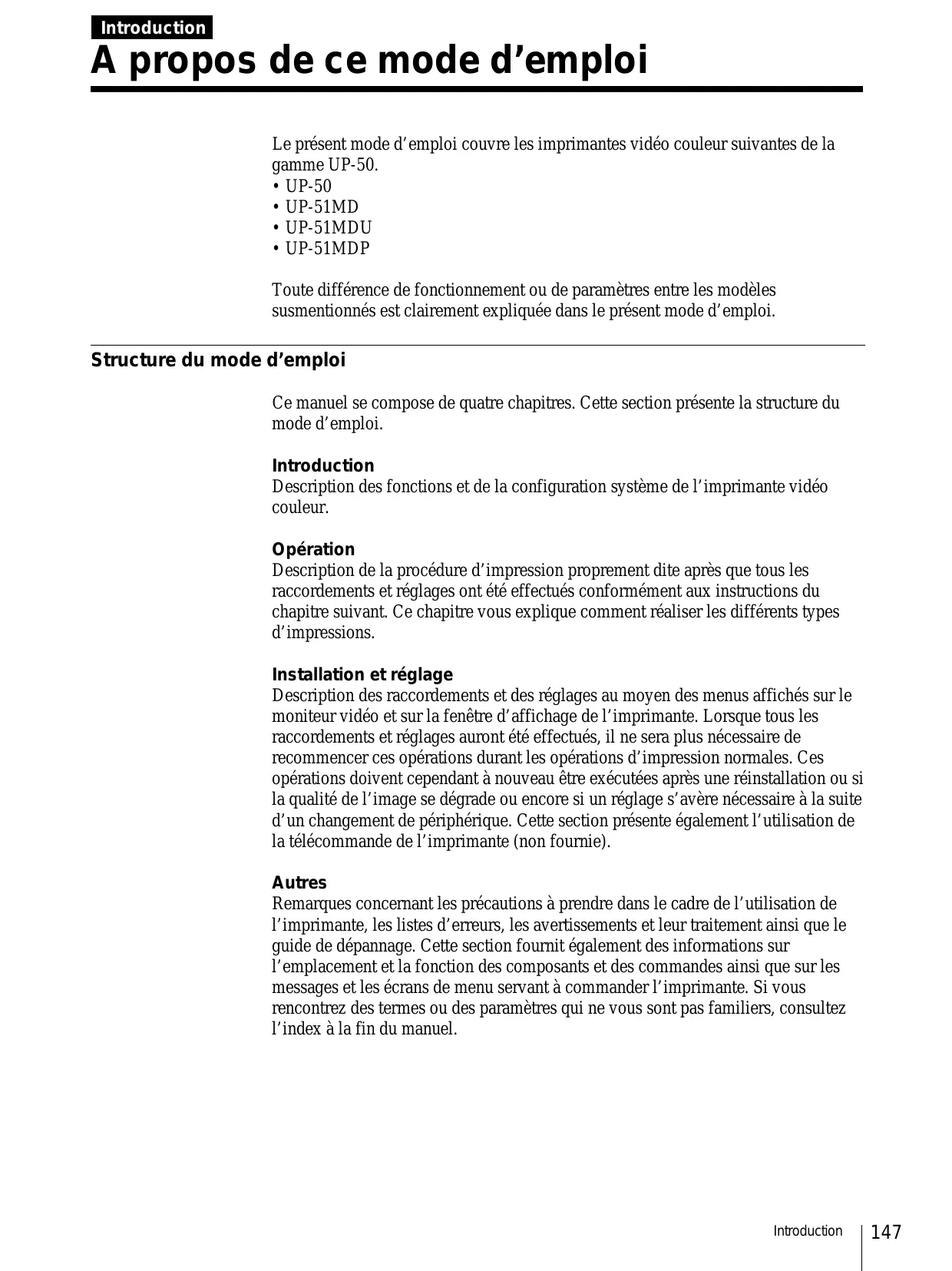 Leprésent mode d'emploi couvre les imprimantes video cocleur suivantes de la gamme UP-50.
