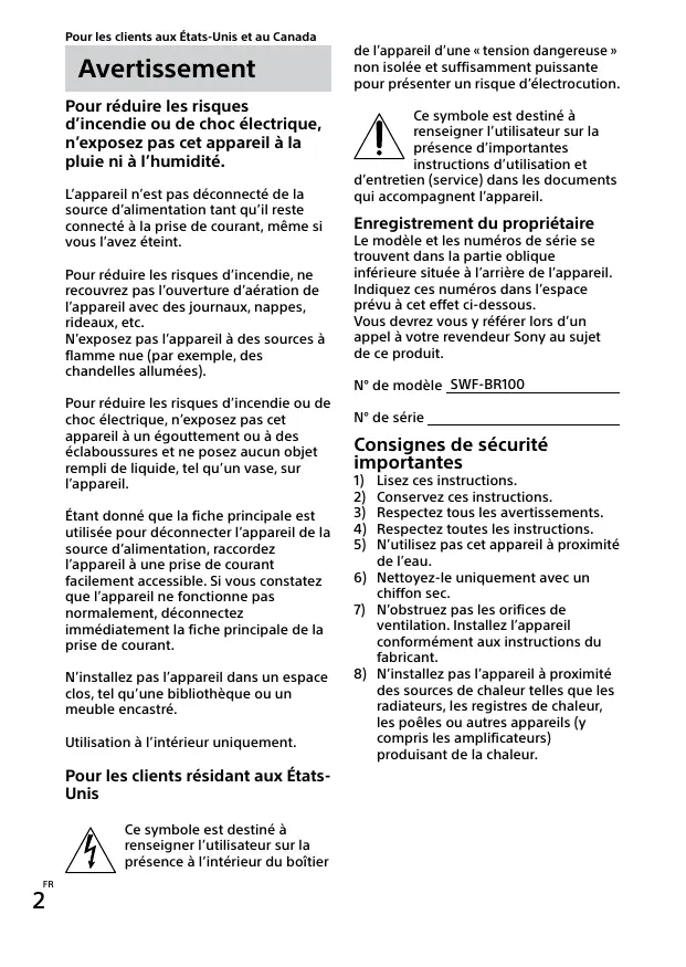 MODE D'EMPLOI SWF-BR100 SONY