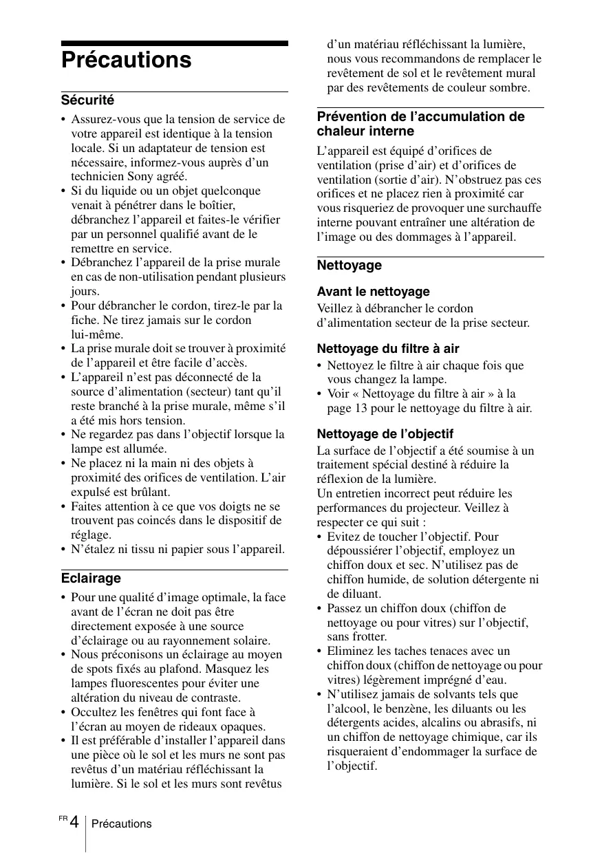 • Assurez-vous que la tension de service de votre appareil est identique à la tension locale. Si un adaptateur de tension est nécessaire, informez-vous auprès d’un technicien Sony agréé. • Si du liquide ou un objet quelconque venait à pénétrer dans le boîtier, débranchez l’appareil et faites-le vérifier par un personnel qualifié avant de le remettre en service. • Débranchez l’appareil de la prise murale en cas de non-utilisation pendant plusieurs jours. • Pour débrancher le cordon, tirez-le par la fiche. Ne tirez jamais sur le cordon lui-même. • La prise murale doit se trouver à proximité de l’appareil et être facile d’accès. • L’appareil n’est pas déconnecté de la source d’alimentation (secteur) tant qu’il reste branché à la prise murale, même s’il a été mis hors tension. • Ne regardez pas dans l’objectif lorsque la lampe est allumée. • Ne placez ni la main ni des objets à proximité des orifices de ventilation. L’air expulsé est brûlant. • Faites attention à ce que vos doigts ne se trouvent pas coincés dans le dispositif de réglage. • N’étalez ni tissu ni papier sous l’appareil.