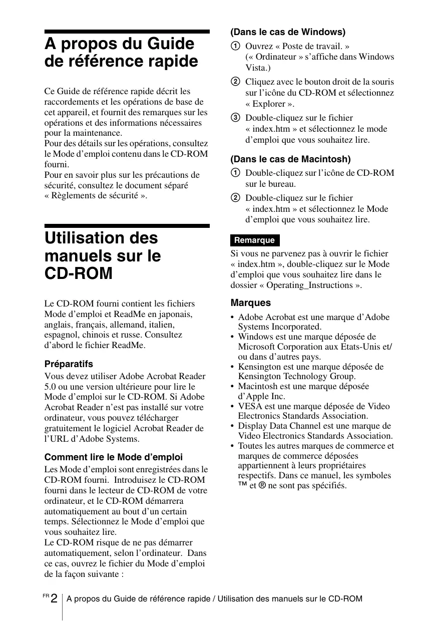 CD-ROM Le CD-ROM fourni contient les fichiers Mode d’emploi et ReadMe en japonais, anglais, français, allemand, italien, espagnol, chinois et russe. Consultez d’abord le fichier ReadMe. Préparatifs Vous devez utiliser Adobe Acrobat Reader 5.0 ou une version ultérieure pour lire le Mode d’emploi sur le CD-ROM. Si Adobe Acrobat Reader n’est pas installé sur votre ordinateur, vous pouvez télécharger gratuitement le logiciel Acrobat Reader de l’URL d’Adobe Systems. Comment lire le Mode d’emploi Les Mode d’emploi sont enregistrées dans le CD-ROM fourni. Introduisez le CD-ROM fourni dans le lecteur de CD-ROM de votre ordinateur, et le CD-ROM démarrera automatiquement au bout d’un certain temps. Sélectionnez le Mode d’emploi que vous souhaitez lire. Le CD-ROM risque de ne pas démarrer automatiquement, selon l’ordinateur. Dans ce cas, ouvrez le fichier du Mode d’emploi de la façon suivante : FR