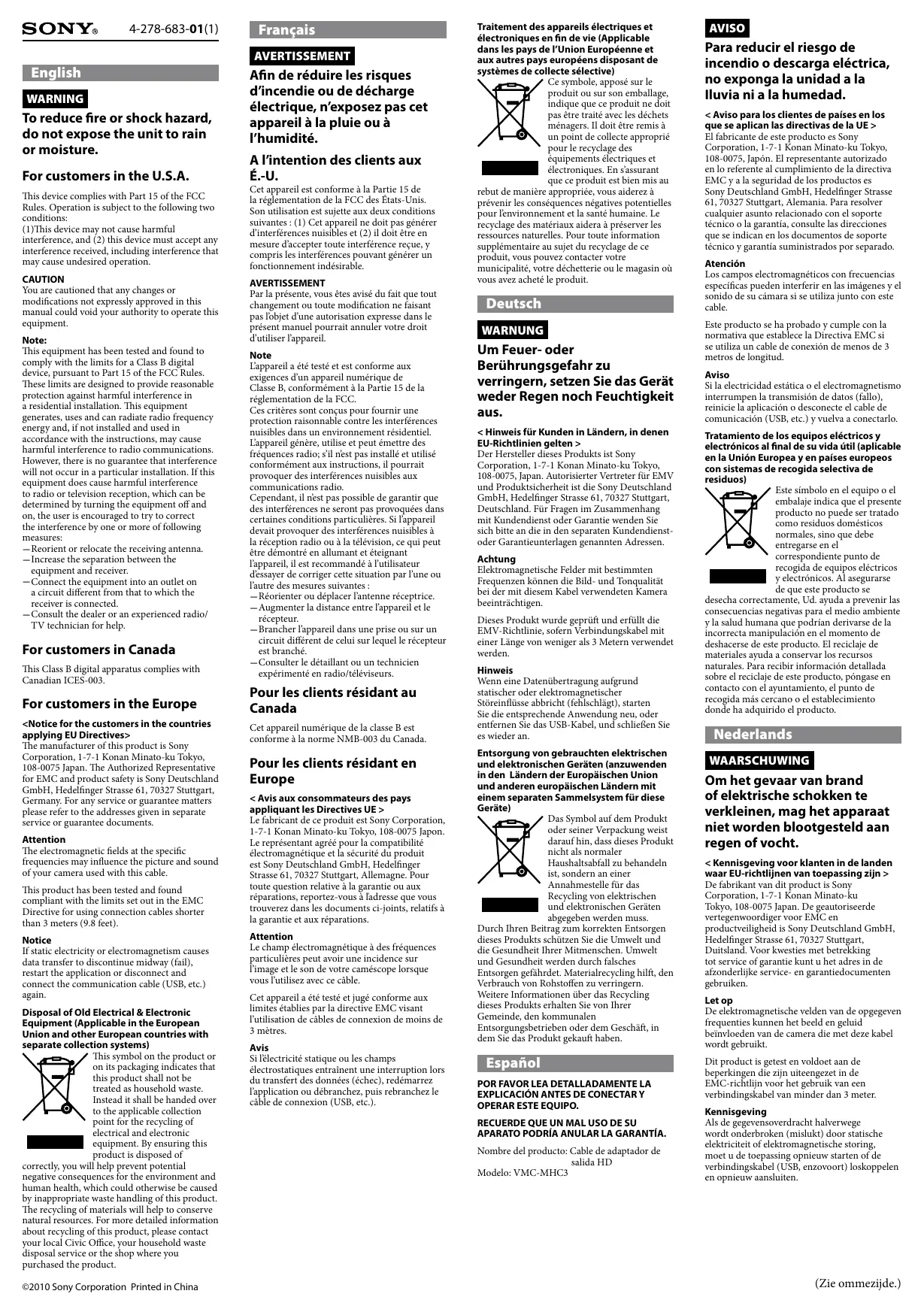 4-278-683-01(1) English WARNING To reduce fire or shock hazard, do not expose the unit to rain or moisture. For customers in the U.S.A. This device complies with Part 15 of the FCC Rules. Operation is subject to the following two conditions: (1)This device may not cause harmful interference, and (2) this device must accept any interference received, including interference that may cause undesired operation. CAUTION You are cautioned that any changes or modifications not expressly approved in this manual could void your authority to operate this equipment. Note: This equipment has been tested and found to comply with the limits for a Class B digital device, pursuant to Part 15 of the FCC Rules. These limits are designed to provide reasonable protection against harmful interference in a residential installation. This equipment generates, uses and can radiate radio frequency energy and, if not installed and used in accordance with the instructions, may cause harmful interference to radio communications. However, there is no guarantee that interference will not occur in a particular installation. If this equipment does cause harmful interference to radio or television reception, which can be determined by turning the equipment off and on, the user is encouraged to try to correct the interference by one or more of following measures: Reorient or relocate the receiving antenna. Increase the separation between the equipment and receiver. Connect the equipment into an outlet on a circuit different from that to which the receiver is connected. Consult the dealer or an experienced radio/ TV technician for help. For customers in Canada This Class B digital apparatus complies with Canadian ICES-003. For customers in the Europe <Notice for the customers in the countries applying EU Directives> The manufacturer of this product is Sony Corporation, 1-7-1 Konan Minato-ku Tokyo, 108-0075 Japan. The Authorized Representative for EMC and product safety is Sony Deutschland GmbH, Hedelfinger Strasse 61, 70327 Stuttgart, Germany. For any service or guarantee matters please refer to the addresses given in separate service or guarantee documents. Attention The electromagnetic fields at the specific frequencies may influence the picture and sound of your camera used with this cable. This product has been tested and found compliant with the limits set out in the EMC Directive for using connection cables shorter than 3 meters (9.8 feet). Notice If static electricity or electromagnetism causes data transfer to discontinue midway (fail), restart the application or disconnect and connect the communication cable (USB, etc.) again. Disposal of Old Electrical & Electronic Equipment (Applicable in the European Union and other European countries with separate collection systems) This symbol on the product or on its packaging indicates that this product shall not be treated as household waste. Instead it shall be handed over to the applicable collection point for the recycling of electrical and electronic equipment. By ensuring this product is disposed of correctly, you will help prevent potential negative consequences for the environment and human health, which could otherwise be caused by inappropriate waste handling of this product. The recycling of materials will help to conserve natural resources. For more detailed information about recycling of this product, please contact your local Civic Office, your household waste disposal service or the shop where you purchased the product. ©2010 Sony Corporation Printed in China Français AVERTISSEMENT Afin de réduire les risques d’incendie ou de décharge électrique, n’exposez pas cet appareil à la pluie ou à l’humidité. A l’intention des clients aux É.-U. Cet appareil est conforme à la Partie 15 de la réglementation de la FCC des États-Unis. Son utilisation est sujette aux deux conditions suivantes : (1) Cet appareil ne doit pas générer d’interférences nuisibles et (2) il doit être en mesure d’accepter toute interférence reçue, y compris les interférences pouvant générer un fonctionnement indésirable. AVERTISSEMENT Par la présente, vous êtes avisé du fait que tout changement ou toute modification ne faisant pas l’objet d’une autorisation expresse dans le présent manuel pourrait annuler votre droit d’utiliser l’appareil. Note L’appareil a été testé et est conforme aux exigences d’un appareil numérique de Classe B, conformément à la Partie 15 de la réglementation de la FCC. Ces critères sont conçus pour fournir une protection raisonnable contre les interférences nuisibles dans un environnement résidentiel. L’appareil génère, utilise et peut émettre des fréquences radio; s’il n’est pas installé et utilisé conformément aux instructions, il pourrait provoquer des interférences nuisibles aux communications radio. Cependant, il n’est pas possible de garantir que des interférences ne seront pas provoquées dans certaines conditions particulières. Si l’appareil devait provoquer des interférences nuisibles à la réception radio ou à la télévision, ce qui peut être démontré en allumant et éteignant l’appareil, il est recommandé à l’utilisateur d’essayer de corriger cette situation par l’une ou l’autre des mesures suivantes : Réorienter ou déplacer l’antenne réceptrice. Augmenter la distance entre l’appareil et le récepteur. Brancher l’appareil dans une prise ou sur un circuit différent de celui sur lequel le récepteur est branché. Consulter le détaillant ou un technicien expérimenté en radio/téléviseurs. Pour les clients résidant au Canada Cet appareil numérique de la classe B est conforme à la norme NMB-003 du Canada. Pour les clients résidant en Europe < Avis aux consommateurs des pays appliquant les Directives UE > Le fabricant de ce produit est Sony Corporation, 1-7-1 Konan Minato-ku Tokyo, 108-0075 Japon. Le représentant agréé pour la compatibilité électrom
