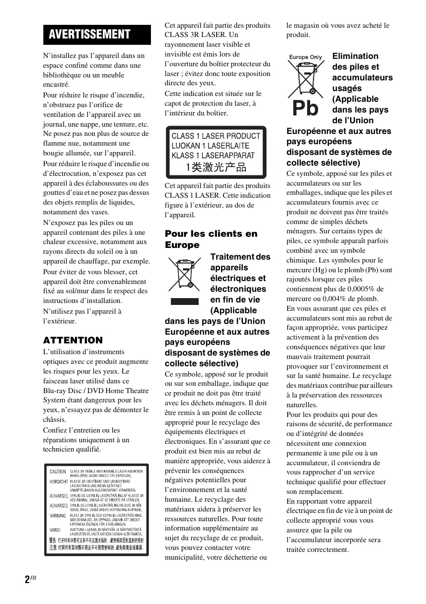 Blu-ray Disc / DVD Home Theatre System étant dangereux pour les yeux, n’essayez pas de démonter le châssis. Confiez l’entretien ou les réparations uniquement à un technicien qualifié.