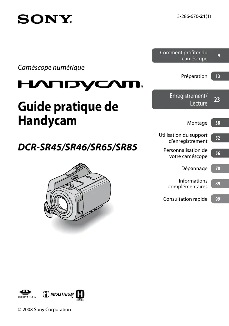 Les indicateurs et écrans ACL reproduits dans ce Guide pratique ont été capturés à l’aide d’un appareil photo numérique. Ils peuvent donc paraître différents de ce que vous voyez réellement. La conception et les caractéristiques techniques des supports d’enregistrement et d’autres accessoires sont sujettes à modification sans préavis. Dans ce Guide pratique, le disque dur de votre caméscope et le « Memory Stick PRO Duo » sont désignés par le terme « support ». Sauf spécification contraire, les illustrations de ce Guide pratique concernent le DCR-SR85.