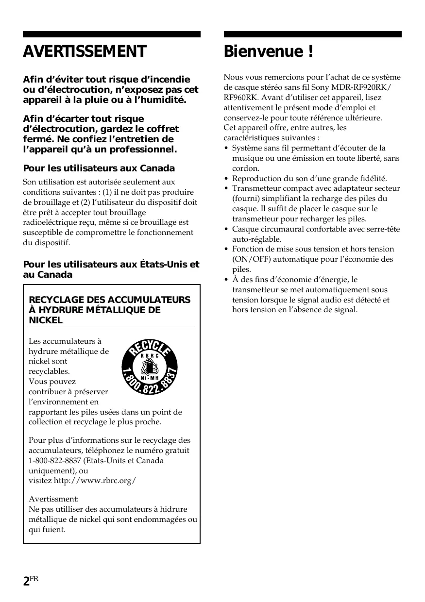 Afin d’éviter tout risque d’incendie ou d’électrocution, n’exposez pas cet appareil à la pluie ou à l’humidité. Nous vous remercions pour l’achat de ce système de casque stéréo sans fil Sony MDR-RF920RK/ RF960RK. Avant d’utiliser cet appareil, lisez attentivement le présent mode d’emploi et conservez-le pour toute référence ultérieure. Cet appareil offre, entre autres, les caractéristiques suivantes :