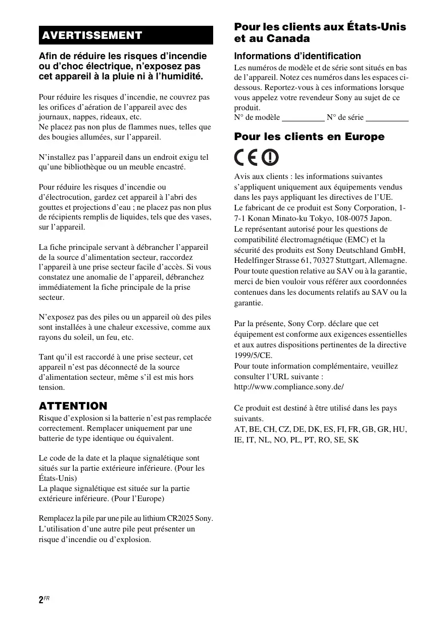 AVERTISSEMENT Afin de réduire les risques d’incendie ou d’choc électrique, n’exposez pas cet appareil à la pluie ni à l’humidité. Pour réduire les risques d’incendie, ne couvrez pas les orifices d’aération de l’appareil avec des journaux, nappes, rideaux, etc. Ne placez pas non plus de flammes nues, telles que des bougies allumées, sur l’appareil. Pour les clients aux États-Unis et au Canada Informations d’identification Les numéros de modèle et de série sont situés en bas de l’appareil. Notez ces numéros dans les espaces cidessous. Reportez-vous à ces informations lorsque vous appelez votre revendeur Sony au sujet de ce produit. N° de série N° de modèle Pour les clients en Europe N’installez pas l’appareil dans un endroit exigu tel qu’une bibliothèque ou un meuble encastré. Pour réduire les risques d’incendie ou d’électrocution, gardez cet appareil à l’abri des gouttes et projections d’eau ; ne placez pas non plus de récipients remplis de liquides, tels que des vases, sur l’appareil. La fiche principale servant à débrancher l’appareil de la source d’alimentation secteur, raccordez l’appareil à une prise secteur facile d’accès. Si vous constatez une anomalie de l’appareil, débranchez immédiatement la fiche principale de la prise secteur. N’exposez pas des piles ou un appareil où des piles sont installées à une chaleur excessive, comme aux rayons du soleil, un feu, etc. Tant qu’il est raccordé à une prise secteur, cet appareil n’est pas déconnecté de la source d’alimentation secteur, même s’il est mis hors tension. ATTENTION Risque d’explosion si la batterie n’est pas remplacée correctement. Remplacer uniquement par une batterie de type identique ou équivalent. Le code de la date et la plaque signalétique sont situés sur la partie extérieure inférieure. (Pour les États-Unis) La plaque signalétique est située sur la partie extérieure inférieure. (Pour l’Europe) Remplacez la pile par une pile au lithium CR2025 Sony. L’utilisation d’une autre pile peut présenter un risque d’incendie ou d’explosion. 2FR Avis aux clients : les informations suivantes s’appliquent uniquement aux équipements vendus dans les pays appliquant les directives de l’UE. Le fabricant de ce produit est Sony Corporation, 17-1 Konan Minato-ku Tokyo, 108-0075 Japon. Le représentant autorisé pour les questions de compatibilité électromagnétique (EMC) et la sécurité des produits est Sony Deutschland GmbH, Hedelfinger Strasse 61, 70327 Stuttgart, Allemagne. Pour toute question relative au SAV ou à la garantie, merci de bien vouloir vous référer aux coordonnées contenues dans les documents relatifs au SAV ou la garantie. Par la présente, Sony Corp. déclare que cet équipement est conforme aux exigences essentielles et aux autres dispositions pertinentes de la directive 1999/5/CE. Pour toute information complémentaire, veuillez consulter l’URL suivante : http://www.compliance.sony.de/ Ce produit est destiné à être utilisé dans les pays suivants. AT, BE, CH, CZ, DE, DK, ES, FI, FR, GB, GR, HU, IE, IT, NL, NO, PL, PT, RO, SE, SK Remarque pour les utilisateurs en France La fonctionnalité WLAN de ce Network Speaker doit exclusivement être utilisée en intérieur. Toute utilisation à l’extérieur de la fonctionnalité WLAN de ce Network Speaker est interdite sur le territoire français. Veillez à vous assurer que la fonctionnalité WLAN de ce Network Speaker est désactivée avant toute utilisation à l’extérieur. (Décision ART n° 2002-1009 dans sa version modifiée par la Décision ART n° 03-908 relative aux restrictions sur l’utilisation des fréquences radio.) Remarque pour les utilisateurs en Italie L’utilisation du réseau RLAN est régie : – en ce qui concerne l’usage privé, par le décret-loi n° 259 du 1.8.2003 (« Code des communications électroniques »). Notamment, l’Article 104 définit les circonstances pour lesquelles l’obtention d’une autorisation générale préalable est requise et l’Article 105 définit les circonstances pour lesquelles une utilisation libre est permise ; – en ce qui concerne la fourniture au public de l’accès RLAN aux réseaux et aux services de télécommunication, par le décret ministériel du