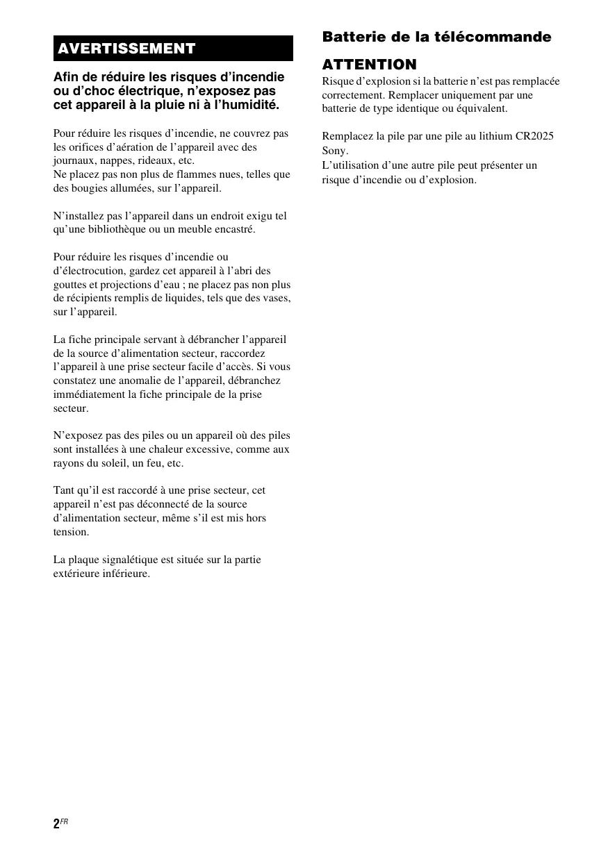Batterie de la télécommande ATTENTION Afin de réduire les risques d’incendie ou d’choc électrique, n’exposez pas cet appareil à la pluie ni à l’humidité. Risque d’explosion si la batterie n’est pas remplacée correctement. Remplacer uniquement par une batterie de type identique ou équivalent. Pour réduire les risques d’incendie, ne couvrez pas les orifices d’aération de l’appareil avec des journaux, nappes, rideaux, etc. Ne placez pas non plus de flammes nues, telles que des bougies allumées, sur l’appareil. Remplacez la pile par une pile au lithium CR2025 Sony. L’utilisation d’une autre pile peut présenter un risque d’incendie ou d’explosion. N’installez pas l’appareil dans un endroit exigu tel qu’une bibliothèque ou un meuble encastré. Pour réduire les risques d’incendie ou d’électrocution, gardez cet appareil à l’abri des gouttes et projections d’eau ; ne placez pas non plus de récipients remplis de liquides, tels que des vases, sur l’appareil. La fiche principale servant à débrancher l’appareil de la source d’alimentation secteur, raccordez l’appareil à une prise secteur facile d’accès. Si vous constatez une anomalie de l’appareil, débranchez immédiatement la fiche principale de la prise secteur. N’exposez pas des piles ou un appareil où des piles sont installées à une chaleur excessive, comme aux rayons du soleil, un feu, etc. Tant qu’il est raccordé à une prise secteur, cet appareil n’est pas déconnecté de la source d’alimentation secteur, même s’il est mis hors tension. La plaque signalétique est située sur la partie extérieure inférieure. 2FR Pour les clients en Europe Avis aux clients : les informations suivantes s’appliquent uniquement aux équipements vendus dans les pays appliquant les directives de l’UE. Le fabricant de ce produit est Sony Corporation, 17-1 Konan Minato-ku Tokyo, 108-0075 Japon. Le représentant autorisé pour les questions de compatibilité électromagnétique (EMC) et la sécurité des produits est Sony Deutschland GmbH, Hedelfinger Strasse 61, 70327 Stuttgart, Allemagne. Pour toute question relative au SAV ou à la garantie, merci de bien vouloir vous référer aux coordonnées contenues dans les documents relatifs au SAV ou la garantie. Cet appareil a été testé et déterminé comme étant conforme aux limites définies dans la Directive EMC en utilisant un câble de raccordement de moins de 3 mètres. Par la présente, Sony Corp. déclare que cet équipement est conforme aux exigences essentielles et aux autres dispositions pertinentes de la directive 1999/5/CE. Pour toute information complémentaire, veuillez consulter l’URL suivante : http://www.compliance.sony.de/ Ce produit est destiné à être utilisé dans les pays suivants. AT, BE, DK, FI, FR, DE, IS, IT, LU, NL, NO, ES, SE, CH, GB, PL Remarque pour les utilisateurs en France La fonctionnalité WLAN de ce Network Speaker doit exclusivement être utilisée en intérieur. Toute utilisation à l’extérieur de la fonctionnalité WLAN de ce Network Speaker est interdite sur le territoire français. Veillez à vous assurer que la fonctionnalité WLAN de ce Network Speaker est désactivée avant toute utilisation à l’extérieur. (Décision ART n° 2002-1009 dans sa version modifiée par la Décision ART n° 03-908 relative aux restrictions sur l’utilisation des fréquences radio.) Remarque pour les utilisateurs en Italie L’utilisation du réseau RLAN est régie : – en ce qui concerne l’usage privé, par le décret-loi n° 259 du 1.8.2003 (« Code des communications électroniques »). Notamment, l’Article 104 définit les circonstances pour lesquelles l’obtention d’une autorisation générale préalable est requise et l’Article 105 définit les circonstances pour lesquelles une utilisation libre est permise ; – en ce qui concerne la fourniture au public de l’accès RLAN aux réseaux et aux services de télécommunication, par le décret ministériel du