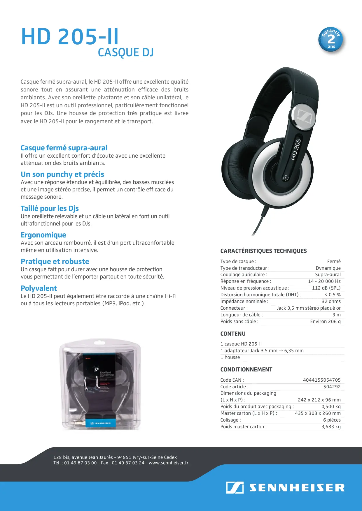 Niveau de pression acoustique : 112 dB (SPL) Distorsion harmonique totale (DHT) : < 0,5 % Impédance nominale : 32 ohms Connecteur : Jack 3,5 mm stéréo plaqué or Longueur de câble : Poids sans câble : Environ 206 g CONTENU 1 casque HD 205-II 1 adaptateur Jack 3,5 mm → 6,35 mm 1 housse CONDITIONNEMENT Code EAN : Code article : Dimensions du packaging (L x H x P) : 242 x 212 x 96 mm Poids du produit avec packaging : 0,500 kg Master carton (L x H x P) : 435 x 303 x 260 mm Colisage : 6 pièces Poids master carton : 3,683 kg 128 bis, avenue Jean Jaurès - 94851 Ivry-sur-Seine Cedex Tél. : 01 49 87 03 00 - Fax : 01 49 87 03 24 - www.sennheiser.fr