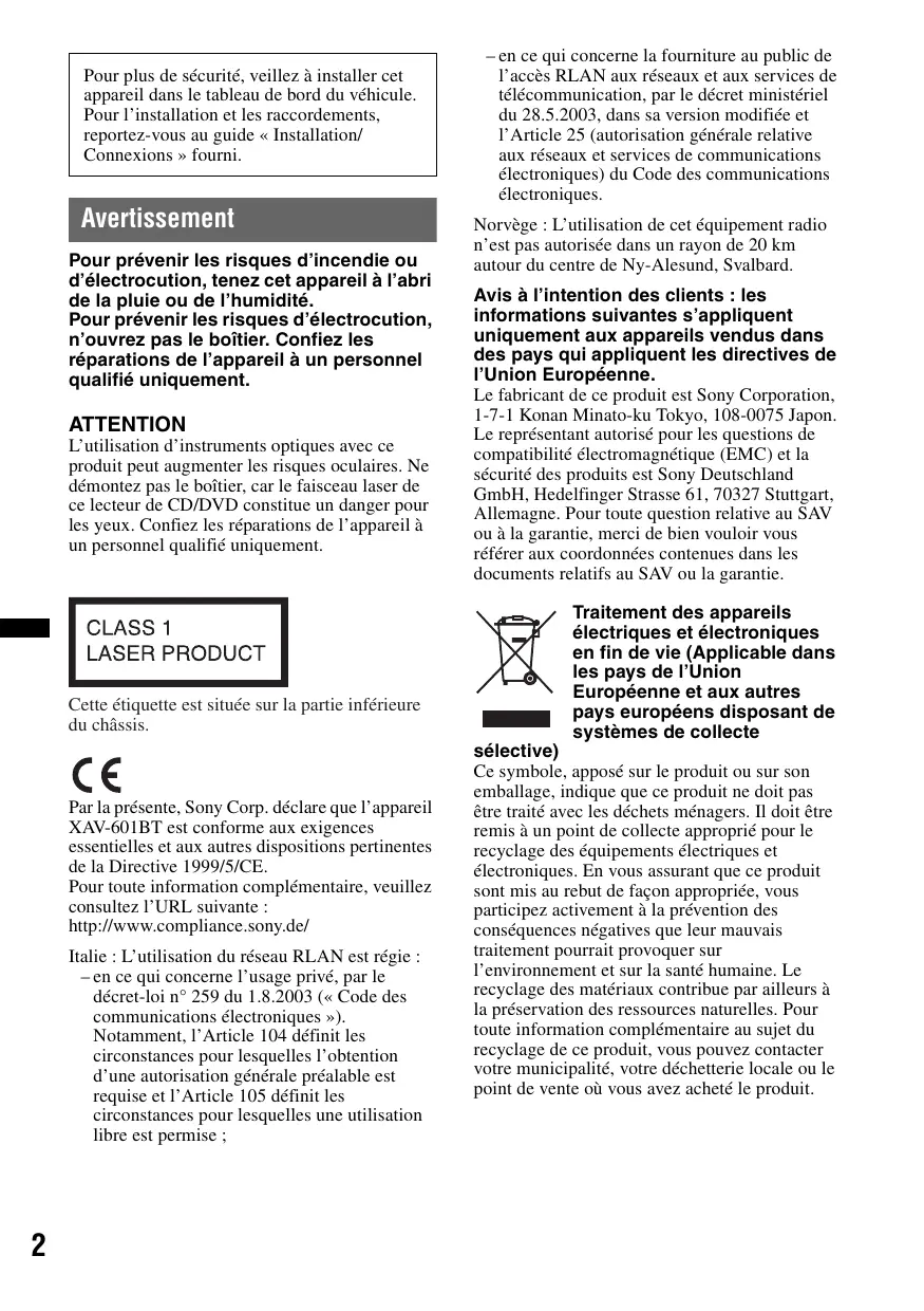 XAV-601BT est conforme aux exigences essentielles et aux autres dispositions pertinentes de la Directive 1999/5/CE. Pour toute information complémentaire, veuillez consultez l’URL suivante : http://www.compliance.sony.de/ Italie : L’utilisation du réseau RLAN est régie : – en ce qui concerne l’usage privé, par le décret-loi n° 259 du 1.8.2003 (« Code des communications électroniques »). Notamment, l’Article 104 définit les circonstances pour lesquelles l’obtention d’une autorisation générale préalable est requise et l’Article 105 définit les circonstances pour lesquelles une utilisation libre est permise ;