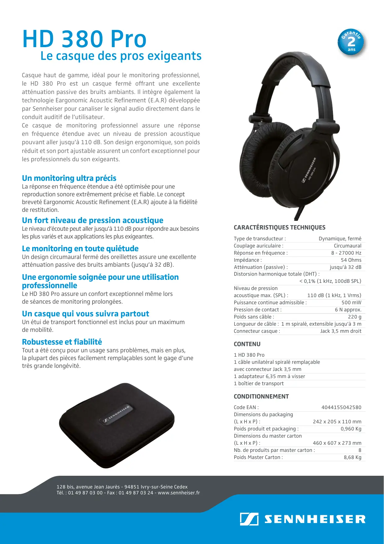Impédance : 54 Ohms Atténuation (passive) : jusqu’à 32 dB Distorsion harmonique totale (DHT) : < 0,1% (1 kHz, 100dB SPL) Niveau de pression acoustique max. (SPL) : 110 dB (1 kHz, 1 Vrms) Puissance continue admissible : 500 mW Pression de contact : 6 N approx. Poids sans câble : 220 g Longueur de câble : 1 m spiralé, extensible jusqu’à 3 m Connecteur casque : Jack 3,5 mm droit Robustesse et fiabilité CONTENU Le monitoring en toute quiétude Un design circumaural fermé des oreillettes assure une excellente atténuation passive des bruits ambiants (jusqu’à 32 dB). Une ergonomie soignée pour une utilisation professionnelle Le HD 380 Pro assure un confort exceptionnel même lors de séances de monitoring prolongées. Un casque qui vous suivra partout Tout a été conçu pour un usage sans problèmes, mais en plus, la plupart des pièces facilement remplaçables sont le gage d’une très grande longévité. 1 HD 380 Pro 1 câble unilatéral spiralé remplaçable avec connecteur Jack 3,5 mm 1 adaptateur 6,35 mm à visser 1 boîtier de transport CONDITIONNEMENT Code EAN : Dimensions du packaging (L x H x P) : 242 x 205 x 110 mm Poids produit et packaging : 0,960 Kg Dimensions du master carton (L x H x P) : 460 x 607 x 273 mm Nb. de produits par master carton : Poids Master Carton : 8,68 Kg 128 bis, avenue Jean Jaurès - 94851 Ivry-sur-Seine Cedex Tél. : 01 49 87 03 00 - Fax : 01 49 87 03 24 - www.sennheiser.fr