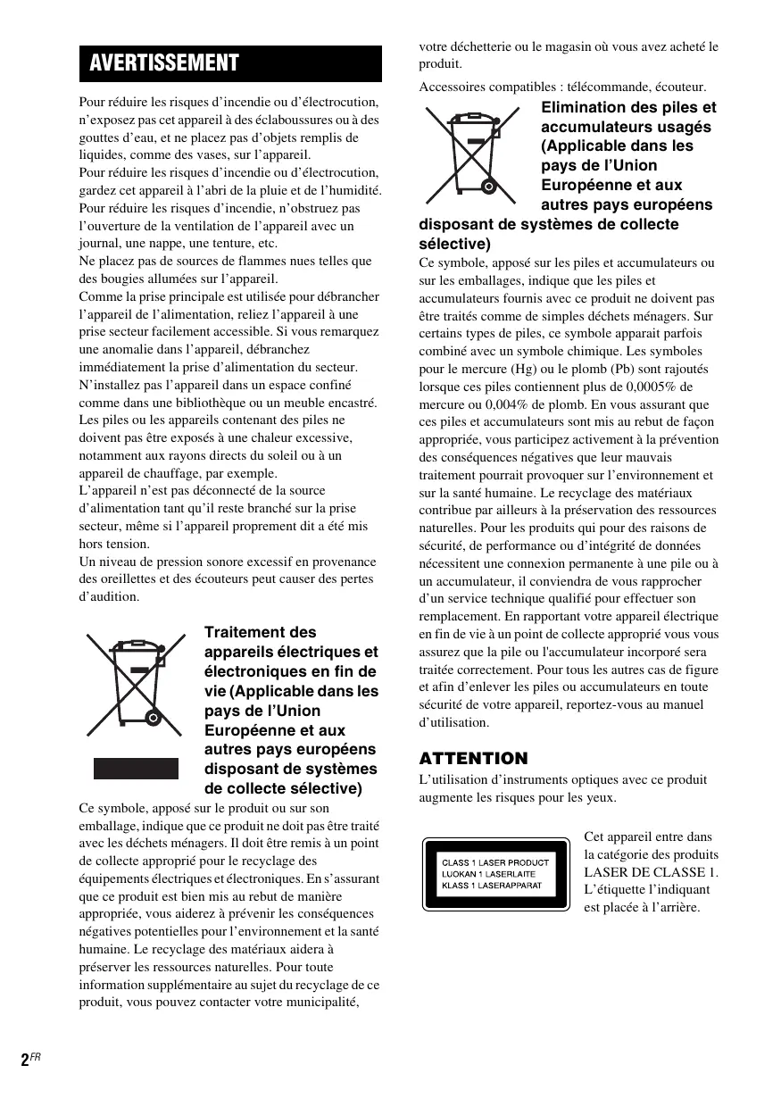 AVERTISSEMENT votre déchetterie ou le magasin où vous avez acheté le produit. Accessoires compatibles : télécommande, écouteur. Pour réduire les risques d’incendie ou d’électrocution, n’exposez pas cet appareil à des éclaboussures ou à des gouttes d’eau, et ne placez pas d’objets remplis de liquides, comme des vases, sur l’appareil. Pour réduire les risques d’incendie ou d’électrocution, gardez cet appareil à l’abri de la pluie et de l’humidité. Pour réduire les risques d’incendie, n’obstruez pas l’ouverture de la ventilation de l’appareil avec un journal, une nappe, une tenture, etc. Ne placez pas de sources de flammes nues telles que des bougies allumées sur l’appareil. Comme la prise principale est utilisée pour débrancher l’appareil de l’alimentation, reliez l’appareil à une prise secteur facilement accessible. Si vous remarquez une anomalie dans l’appareil, débranchez immédiatement la prise d’alimentation du secteur. N’installez pas l’appareil dans un espace confiné comme dans une bibliothèque ou un meuble encastré. Les piles ou les appareils contenant des piles ne doivent pas être exposés à une chaleur excessive, notamment aux rayons directs du soleil ou à un appareil de chauffage, par exemple. L’appareil n’est pas déconnecté de la source d’alimentation tant qu’il reste branché sur la prise secteur, même si l’appareil proprement dit a été mis hors tension. Un niveau de pression sonore excessif en provenance des oreillettes et des écouteurs peut causer des pertes d’audition. Traitement des appareils électriques et électroniques en fin de vie (Applicable dans les pays de l’Union Européenne et aux autres pays européens disposant de systèmes de collecte sélective) Ce symbole, apposé sur le produit ou sur son emballage, indique que ce produit ne doit pas être traité avec les déchets ménagers. Il doit être remis à un point de collecte approprié pour le recyclage des équipements électriques et électroniques. En s’assurant que ce produit est bien mis au rebut de manière appropriée, vous aiderez à prévenir les conséquences négatives potentielles pour l’environnement et la santé humaine. Le recyclage des matériaux aidera à préserver les ressources naturelles. Pour toute information supplémentaire au sujet du recyclage de ce produit, vous pouvez contacter votre municipalité, 2FR Elimination des piles et accumulateurs usagés (Applicable dans les pays de l’Union Européenne et aux autres pays européens disposant de systèmes de collecte sélective) Ce symbole, apposé sur les piles et accumulateurs ou sur les emballages, indique que les piles et accumulateurs fournis avec ce produit ne doivent pas être traités comme de simples déchets ménagers. Sur certains types de piles, ce symbole apparait parfois combiné avec un symbole chimique. Les symboles pour le mercure (Hg) ou le plomb (Pb) sont rajoutés lorsque ces piles contiennent plus de 0,0005% de mercure ou 0,004% de plomb. En vous assurant que ces piles et accumulateurs sont mis au rebut de façon appropriée, vous participez activement à la prévention des conséquences négatives que leur mauvais traitement pourrait provoquer sur l’environnement et sur la santé humaine. Le recyclage des matériaux contribue par ailleurs à la préservation des ressources naturelles. Pour les produits qui pour des raisons de sécurité, de performance ou d’intégrité de données nécessitent une connexion permanente à une pile ou à un accumulateur, il conviendra de vous rapprocher d’un service technique qualifié pour effectuer son remplacement. En rapportant votre appareil électrique en fin de vie à un point de collecte approprié vous vous assurez que la pile ou l'accumulateur incorporé sera traitée correctement. Pour tous les autres cas de figure et afin d’enlever les piles ou accumulateurs en toute sécurité de votre appareil, reportez-vous au manuel d’utilisation. ATTENTION L’utilisation d’instruments optiques avec ce produit augmente les risques pour les yeux. Cet appareil entre dans la catégorie des produits LASER DE CLASSE 1. L’étiquette l’indiquant est placée à l’arrière. Avis aux consommateurs : les informations suivantes ne s’appliquent qu’aux équipements vendus dans des pays appliquant les Directives UE. Le fabricant de ce produit est Sony Corporation, 1-7-1 Konan Minato-ku Tokyo, 108-0075 Japon. Le représentant autorisé pour les questions de compatibilité électromagnétique (EMC) et la sécurité des produits est Sony Deutschland GmbH, Hedelfinger Strasse 61, 70327 Stuttgart, Allemagne. Pour toute question relative au SAV ou à la garantie, merci de bien vouloir vous référer aux coordonnées contenues dans les documents relatifs au SAV ou la garantie.