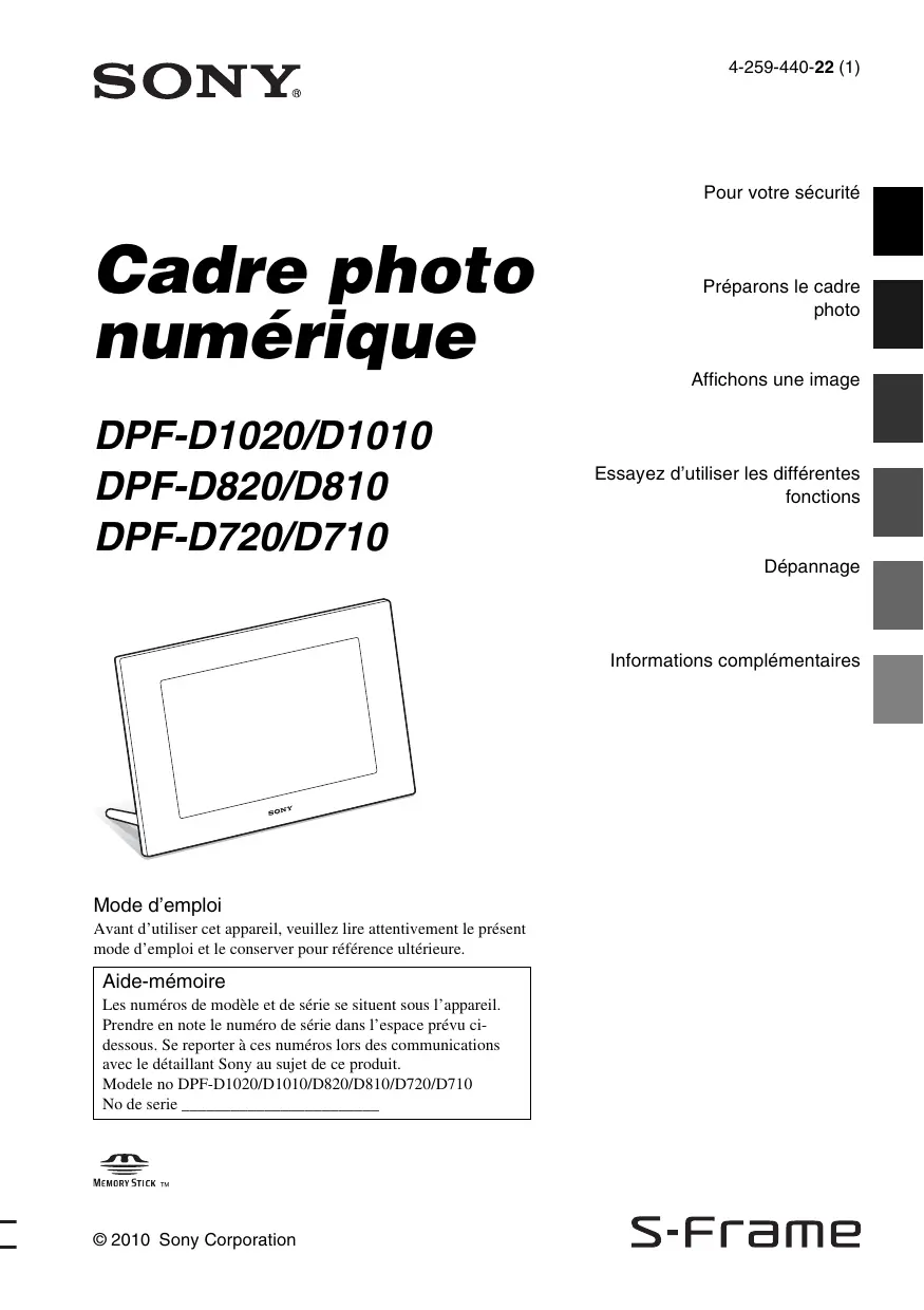 Retrouvez gratuitement la notice de l'appareil DPF-D1020 SONY au format PDF.