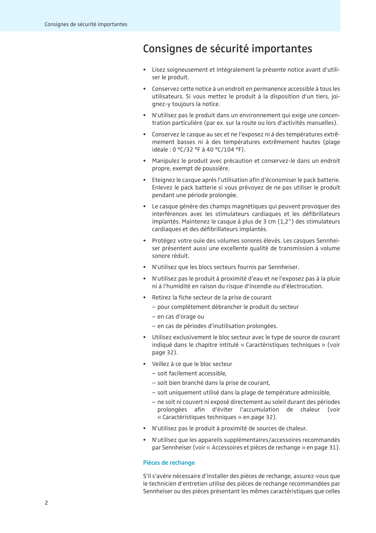 N’utilisez que les appareils supplémentaires/accessoires recommandés par Sennheiser (voir « Accessoires et pièces de rechange » en page 31). Pièces de rechange S’il s’avère nécessaire d’installer des pièces de rechange, assurez-vous que le technicien d’entretien utilise des pièces de rechange recommandées par Sennheiser ou des pièces présentant les mêmes caractéristiques que celles