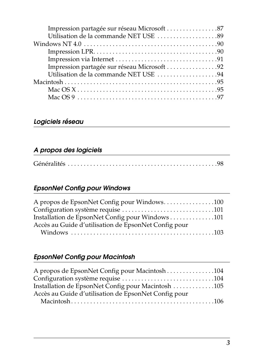 • EpsonNet Config pour Macintosh A propos de EpsonNet Config pour Macintosh p. 104