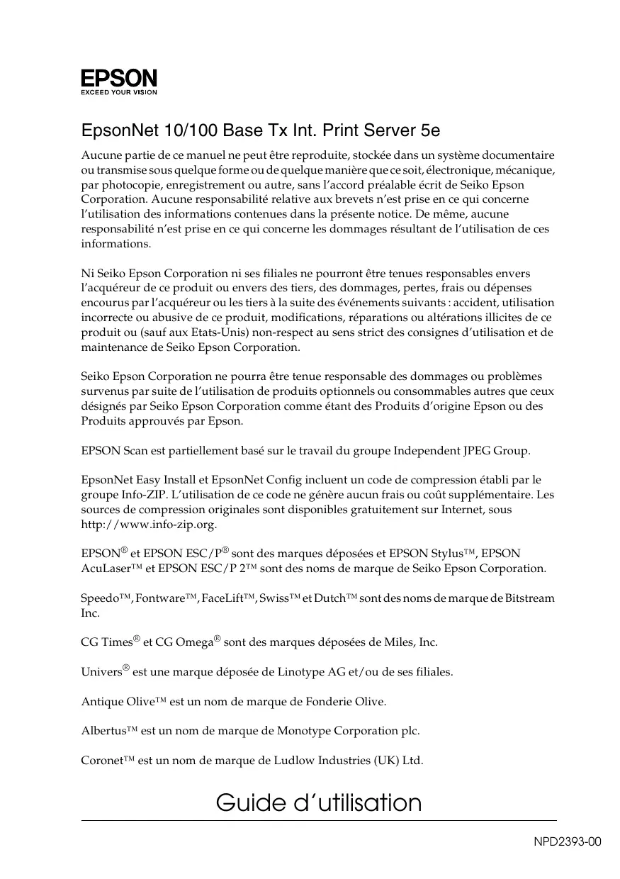 EpsonNet 10/100 Base Tx Int. Print Server 5e Aucune partie de ce manuel ne peut être reproduite, stockée dans un système documentaire ou transmise sous quelque forme ou de quelque manière que ce soit, électronique, mécanique, par photocopie, enregistrement ou autre, sans l’accord préalable écrit de Seiko Epson Corporation. Aucune responsabilité relative aux brevets n’est prise en ce qui concerne l’utilisation des informations contenues dans la présente notice. De même, aucune responsabilité n’est prise en ce qui concerne les dommages résultant de l’utilisation de ces informations. Ni Seiko Epson Corporation ni ses filiales ne pourront être tenues responsables envers l’acquéreur de ce produit ou envers des tiers, des dommages, pertes, frais ou dépenses encourus par l’acquéreur ou les tiers à la suite des événements suivants : accident, utilisation incorrecte ou abusive de ce produit, modifications, réparations ou altérations illicites de ce produit ou (sauf aux Etats-Unis) non-respect au sens strict des consignes d’utilisation et de maintenance de Seiko Epson Corporation. Seiko Epson Corporation ne pourra être tenue responsable des dommages ou problèmes survenus par suite de l’utilisation de produits optionnels ou consommables autres que ceux désignés par Seiko Epson Corporation comme étant des Produits d’origine Epson ou des Produits approuvés par Epson. EPSON Scan est partiellement basé sur le travail du groupe Independent JPEG Group. EpsonNet Easy Install et EpsonNet Config incluent un code de compression établi par le groupe Info-ZIP. L’utilisation de ce code ne génère aucun frais ou coût supplémentaire. Les sources de compression originales sont disponibles gratuitement sur Internet, sous http://www.info-zip.org. EPSON® et EPSON ESC/P® sont des marques déposées et EPSON Stylus™, EPSON AcuLaser™ et EPSON ESC/P 2™ sont des noms de marque de Seiko Epson Corporation. Speedo™, Fontware™, FaceLift™, Swiss™ et Dutch™ sont des noms de marque de Bitstream Inc. CG Times® et CG Omega® sont des marques déposées de Miles, Inc. Univers® est une marque déposée de Linotype AG et/ou de ses filiales. Antique Olive™ est un nom de marque de Fonderie Olive. Albertus™ est un nom de marque de Monotype Corporation plc. Coronet™ est un nom de marque de Ludlow Industries (UK) Ltd. Guide d’utilisation NPD2393-00 Arial® et Times New Roman® sont des marques déposées de Monotype Corporation plc. Sun, Sun Microsystems, le logo Sun et le logo Java sont des noms de marque ou des marques déposées de Sun Microsystems, Inc. aux Etats-Unis et dans d’autres pays. HP® et HP LaserJet® sont des marques déposées de Hewlett-Packard Company. Microsoft®, Windows® et Windows NT® sont des marques déposées de Microsoft Corporation. Macintosh®, AppleTalk®, EtherTalk® et Bonjour® sont des marques déposées de Apple Computer, inc. Adobe™ et PostScript™ sont des noms de marque de Adobe Systems Incorporated qui peuvent être déposés dans certaines juridictions. Ce produit inclut des logiciels développés par l’Université de Berkeley (Californie) et ses collaborateurs. Avis général : les autres noms de produit utilisés dans cette notice sont donnés uniquement à titre d’identification et peuvent être des noms de marque de leurs détenteurs respectifs. Epson dénie toute responsabilité vis-à-vis de ces marques. Copyright © 2006 Seiko Epson Corporation. Tous droits réservés.