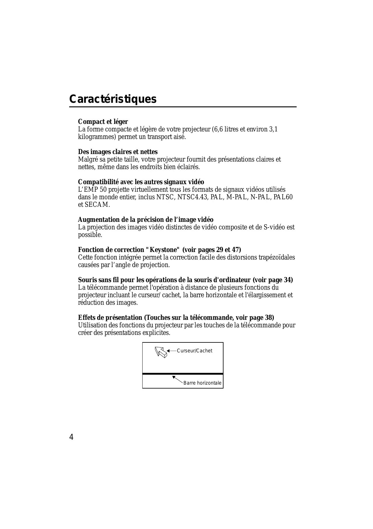 Caractéristiques Compact et léger La forme compacte et légère de votre projecteur (6,6 litres et environ 3,1 kilogrammes) permet un transport aisé. Des images claires et nettes Malgré sa petite taille, votre projecteur fournit des présentations claires et nettes, même dans les endroits bien éclairés. Compatibilité avec les autres signaux vidéo L’EMP 50 projette virtuellement tous les formats de signaux vidéos utilisés dans le monde entier, inclus NTSC, NTSC4.43, PAL, M-PAL, N-PAL, PAL60 et SECAM. Augmentation de la précision de l’image vidéo La projection des images vidéo distinctes de vidéo composite et de S-vidéo est possible. Fonction de correction "Keystone" (voir pages 29 et 47) Cette fonction intégrée permet la correction facile des distorsions trapézoïdales causées par l’angle de projection. Souris sans fil pour les opérations de la souris d'ordinateur (voir page 34) La télécommande permet l'opération à distance de plusieurs fonctions du projecteur incluant le curseur/ cachet, la barre horizontale et l'élargissement et réduction des images. Effets de présentation (Touches sur la télécommande, voir page 38) Utilisation des fonctions du projecteur par les touches de la télécommande pour créer des présentations explicites. Curseur/Cachet Barre horizontale