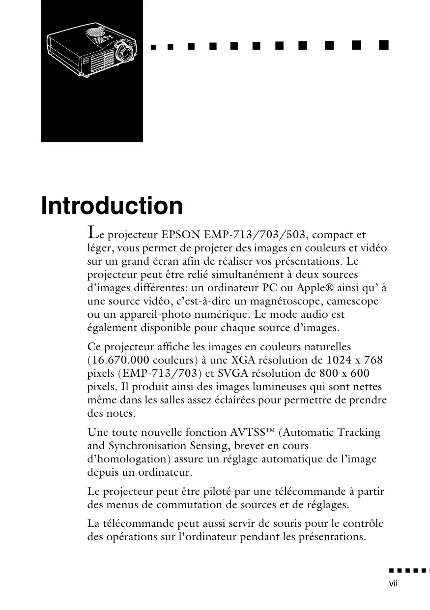 Introduction Le projecteur EPSON EMP-713/703/503, compact et léger, vous permet de projeter des images en couleurs et vidéo sur un grand écran afin de réaliser vos présentations. Le projecteur peut être relié simultanément à deux sources d’images différentes: un ordinateur PC ou Apple® ainsi qu’ à une source vidéo, c’est-à-dire un magnétoscope, camescope ou un appareil-photo numérique. Le mode audio est également disponible pour chaque source d’images. Ce projecteur affiche les images en couleurs naturelles (16.670.000 couleurs) à une XGA résolution de 1024 x 768 pixels (EMP-713/703) et SVGA résolution de 800 x 600 pixels. Il produit ainsi des images lumineuses qui sont nettes même dans les salles assez éclairées pour permettre de prendre des notes. Une toute nouvelle fonction AVTSS™ (Automatic Tracking and Synchronisation Sensing, brevet en cours d’homologation) assure un réglage automatique de l’image depuis un ordinateur. Le projecteur peut être piloté par une télécommande à partir des menus de commutation de sources et de réglages. La télécommande peut aussi servir de souris pour le contrôle des opérations sur l'ordinateur pendant les présentations. ■ ■ ■ ■ ■ ■ vii Le projecteur se caractérise par une nouvelle technologie du redimensionnement, le DAR (Digital Active Resizing), qui supporte la sortie d’ordinateur VGA~UXGA (L’ EMP-503 ne supporte pas UXGA). Quelle que soit la sortie ordinateur utilisée, l’image obtenue sera complète et d’une parfaite netteté. La source vidéo peut être NTSC, NTSC4.43, NTSC50, PAL, M-PAL, N-PAL, PAL60 ou SECAM et dans le format S-vidéo ou vidéo composite. Se reporter au chapitre 6 pour les détails au sujet des ordinateurs et des formats S-vidéo supportés.