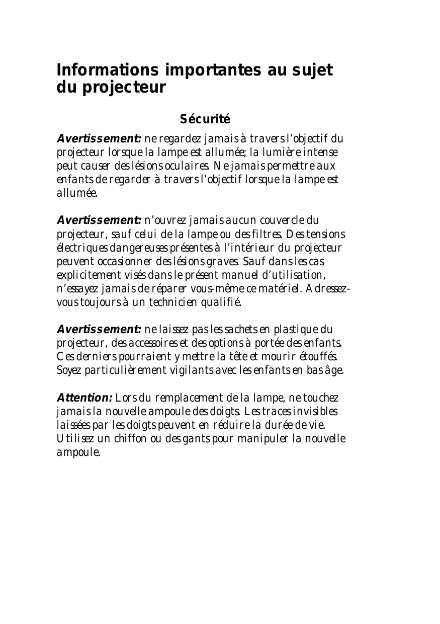 projecteur lorsque la lampe est allumée; la lumière intense peut causer des lésions oculaires. Ne jamais permettre aux enfants de regarder à travers l’objectif lorsque la lampe est allumée.