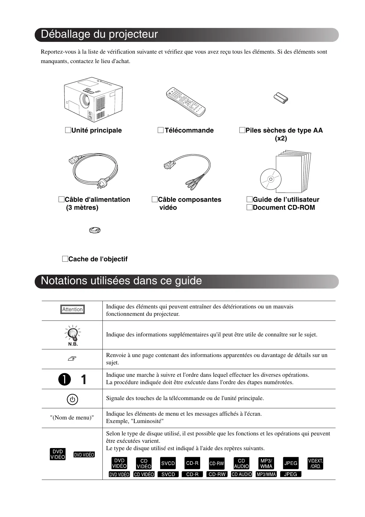 Déballage du projecteur Reportez-vous à la liste de vérification suivante et vérifiez que vous avez reçu tous les éléments. Si des éléments sont manquants, contactez le lieu d'achat. YUnité principale Y Télécommande YPiles sèches de type AA (x2) YCâble d'alimentation (3 mètres) YCâble composantes vidéo YGuide de l’utilisateur YDocument CD-ROM YCache de l'objectif Notations utilisées dans ce guide Indique des éléments qui peuvent entraîner des détériorations ou un mauvais fonctionnement du projecteur. Indique des informations supplémentaires qu'il peut être utile de connaître sur le sujet.