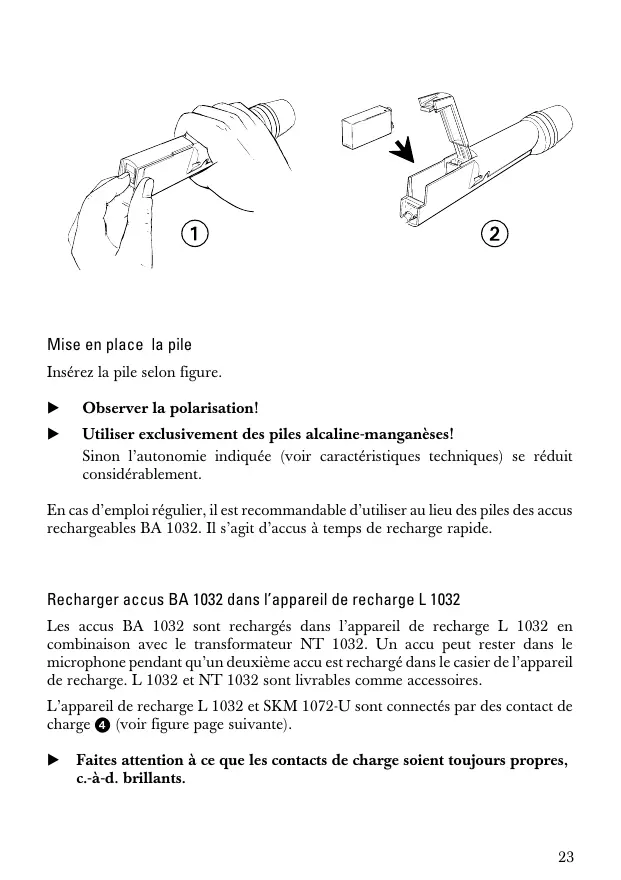 Utiliser exclusivement des piles alcaline-manganèses! Sinon l’autonomie indiquée (voir caractéristiques techniques) se réduit considérablement. En cas d’emploi régulier, il est recommandable d’utiliser au lieu des piles des accus rechargeables BA 1032. Il s’agit d’accus à temps de recharge rapide. Recharger accus BA 1032 dans l’appareil de recharge L 1032 Les accus BA 1032 sont rechargés dans l’appareil de recharge L 1032 en combinaison avec le transformateur NT 1032. Un accu peut rester dans le microphone pendant qu’un deuxième accu est rechargé dans le casier de l’appareil de recharge. L 1032 et NT 1032 sont livrables comme accessoires. L’appareil de recharge L 1032 et SKM 1072-U sont connectés par des contact de charge (voir figure page suivante).