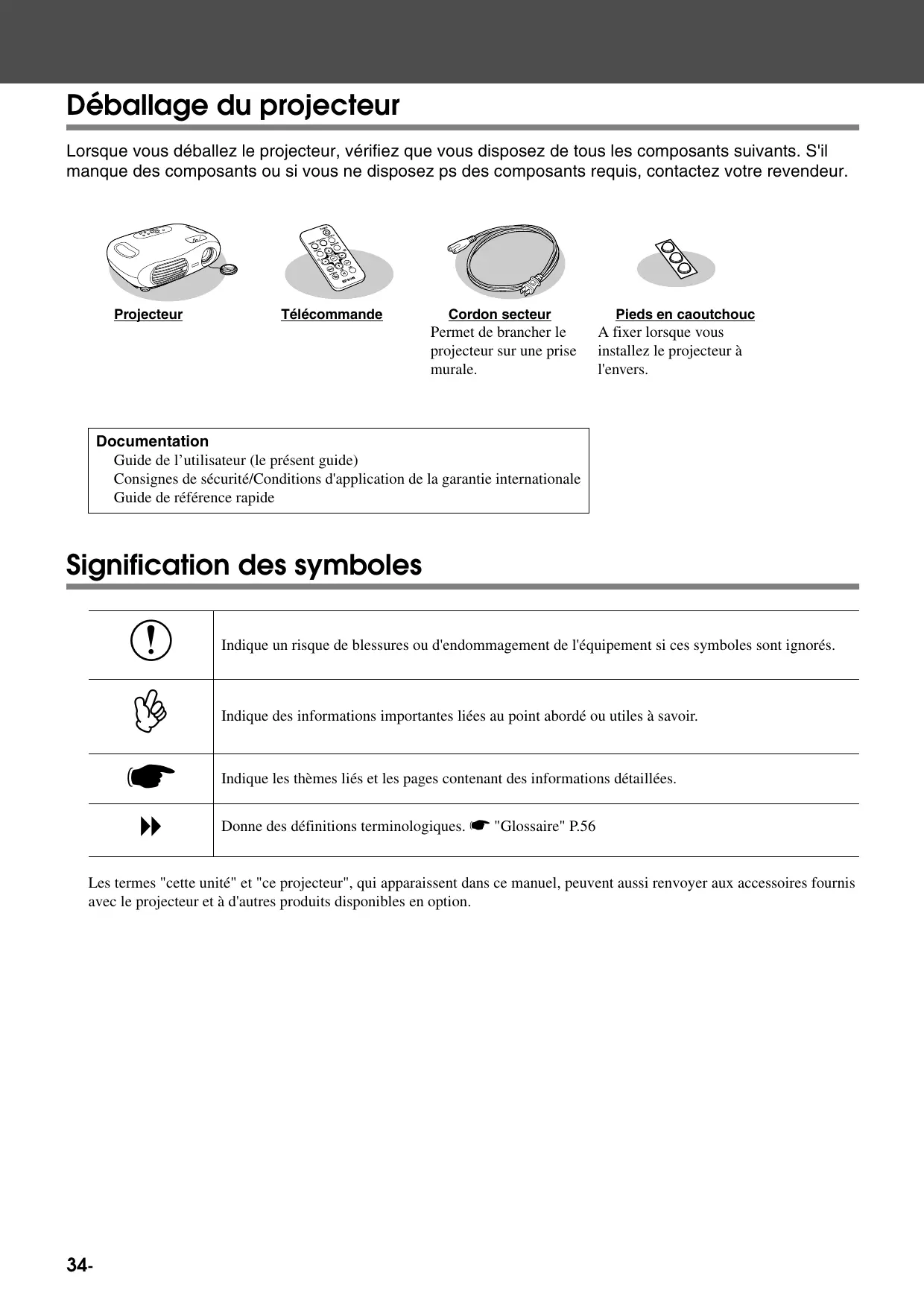 Guide de l'utilisateur Table des matières Déballage du projecteur 34 Signification des symboles 34