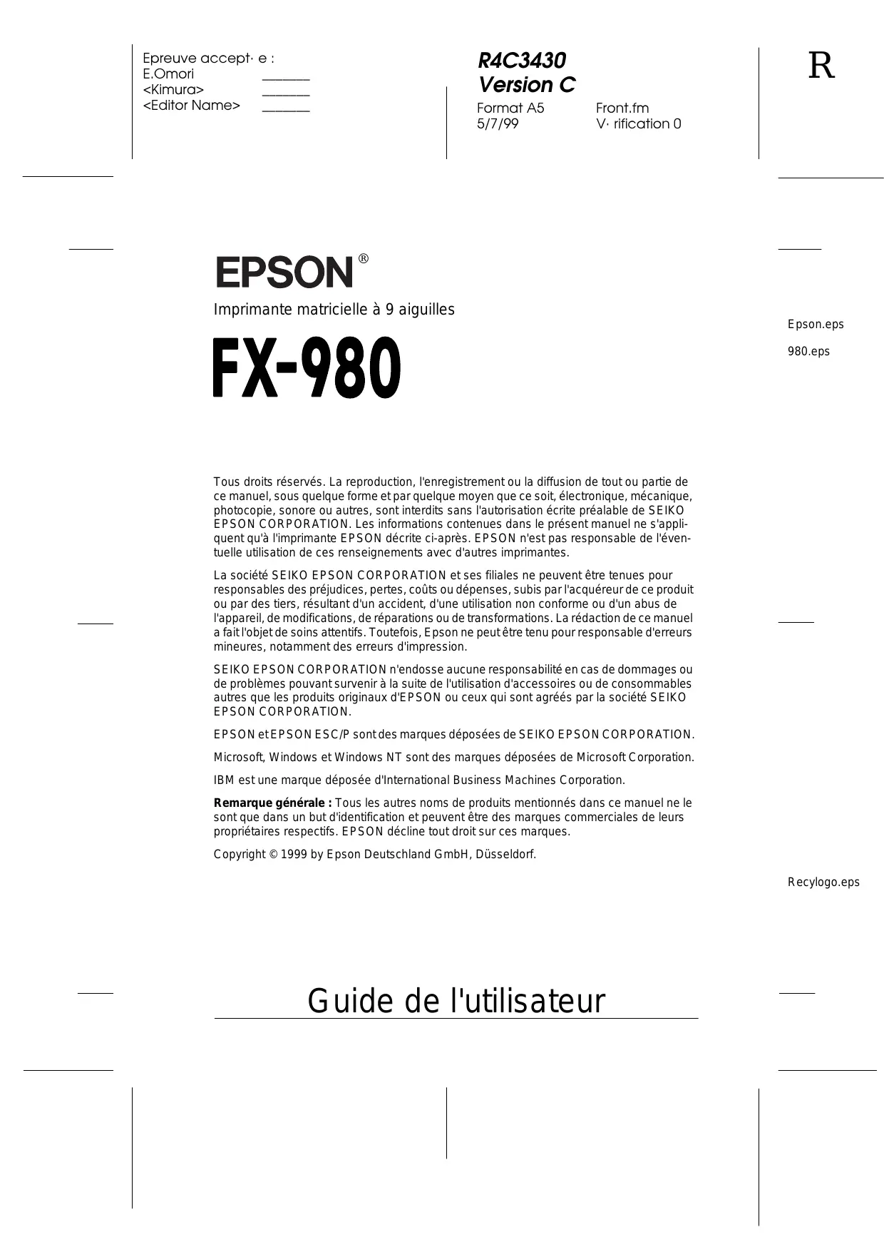 Imprimante matricielle à 9 aiguilles Epson.eps 980.eps Tous droits réservés. La reproduction, l'enregistrement ou la diffusion de tout ou partie de ce manuel, sous quelque forme et par quelque moyen que ce soit, électronique, mécanique, photocopie, sonore ou autres, sont interdits sans l'autorisation écrite préalable de SEIKO EPSON CORPORATION. Les informations contenues dans le présent manuel ne s'appliquent qu'à l'imprimante EPSON décrite ci-après. EPSON n'est pas responsable de l'éventuelle utilisation de ces renseignements avec d'autres imprimantes. La société SEIKO EPSON CORPORATION et ses filiales ne peuvent être tenues pour responsables des préjudices, pertes, coûts ou dépenses, subis par l'acquéreur de ce produit ou par des tiers, résultant d'un accident, d'une utilisation non conforme ou d'un abus de l'appareil, de modifications, de réparations ou de transformations. La rédaction de ce manuel a fait l'objet de soins attentifs. Toutefois, Epson ne peut être tenu pour responsable d'erreurs mineures, notamment des erreurs d'impression. SEIKO EPSON CORPORATION n'endosse aucune responsabilité en cas de dommages ou de problèmes pouvant survenir à la suite de l'utilisation d'accessoires ou de consommables autres que les produits originaux d'EPSON ou ceux qui sont agréés par la société SEIKO EPSON CORPORATION. EPSON et EPSON ESC/P sont des marques déposées de SEIKO EPSON CORPORATION. Microsoft, Windows et Windows NT sont des marques déposées de Microsoft Corporation. IBM est une marque déposée d'International Business Machines Corporation. Remarque générale : Tous les autres noms de produits mentionnés dans ce manuel ne le sont que dans un but d'identification et peuvent être des marques commerciales de leurs propriétaires respectifs. EPSON décline tout droit sur ces marques. Copyright © 1999 by Epson Deutschland GmbH, Düsseldorf. Recylogo.eps Guide de l'utilisateur